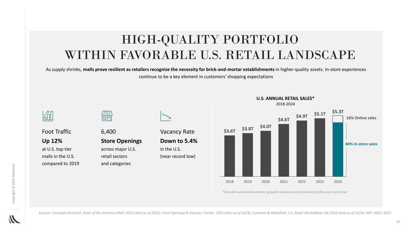 C o p yr ig h t©2025 m ac er ic h 9美国区域购物中心数量的收缩反映了一种战略整合,主要影响表现较差的物业。相比之下,顶级甲级购物中心则表现出韧性和持续增长,这得益于强劲的出租率、较高的每平方英尺销售额和增加的客流量战略重点关注A级购物中心来源:Green Street Advisors,2025年5月21日;Coresight Research 2023“The State of the American Mall”,Cushman & Wakefield Q4 2024~92%的Macerich NOI来自A级或更高级别的物业,突显出我们在表现最佳的零售房地产细分市场的强大定位~92% A级GO-forward portfolio % of Macerich PRo-RATA NOI
