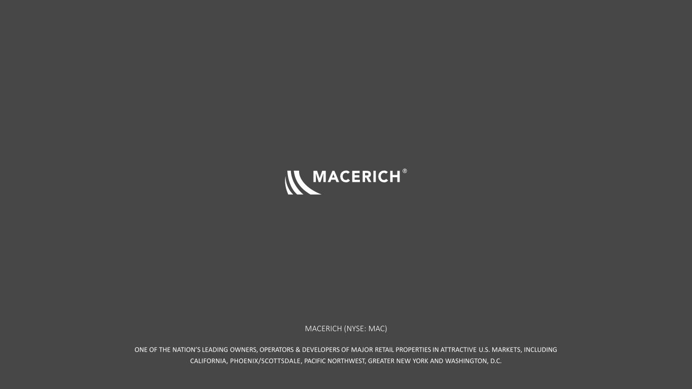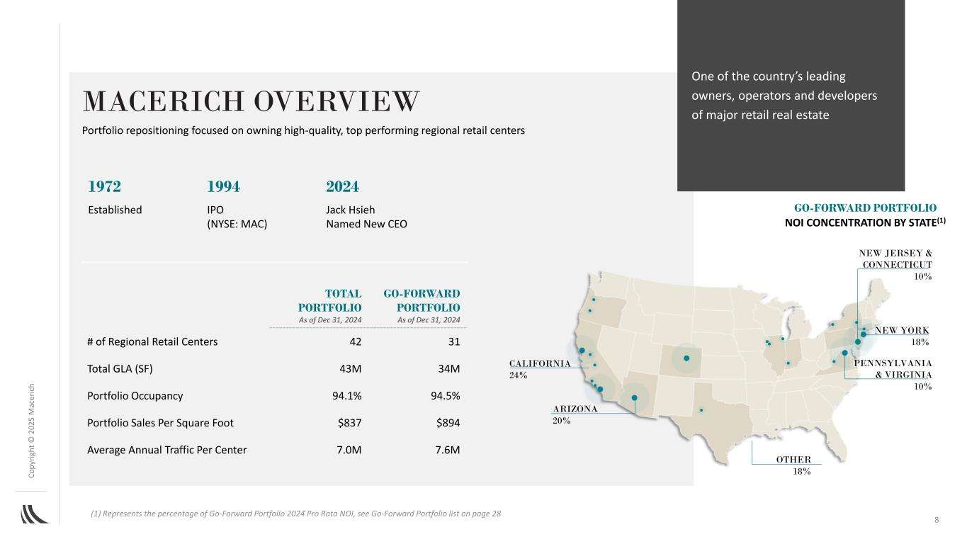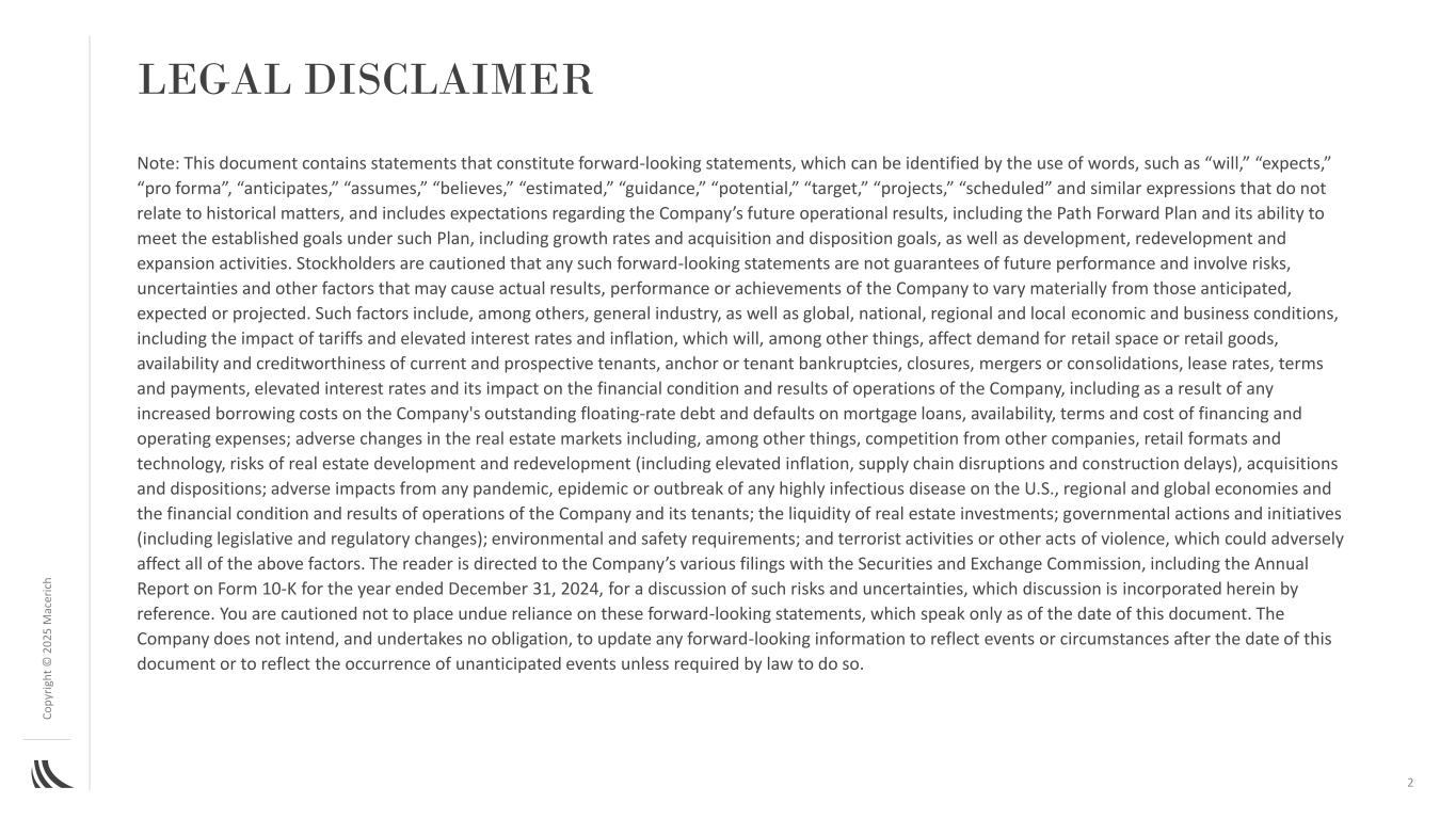 C o p yr ig h t©202 5M AC ER IC H法律免责声明注:本文件包含构成前瞻性陈述的陈述,可以通过使用诸如“将”、“预期”、“备考”、“预期”、“假设”、“相信”、“估计”、“指导”、“潜力”、“目标”、“项目”等词语来识别,与历史事项无关的“预定”和类似表述,包括对公司未来运营结果的预期,包括路径前进计划及其在该计划下实现既定目标的能力,包括增长率、收购和处置目标,以及开发、再开发和扩张活动。请股东注意,任何此类前瞻性陈述都不是对未来业绩的保证,并且涉及风险、不确定性和其他因素,可能导致公司的实际结果、业绩或成就与预期、预期或预测存在重大差异。这些因素包括(其中包括)一般行业,以及全球、国家、区域和地方的经济和商业状况,包括关税和利率上升和通货膨胀的影响,这将(其中包括)影响对零售空间或零售商品的需求、现有和潜在租户的可用性和信誉、锚定或租户破产、关闭、合并或合并、租赁利率、条款和付款、利率上升及其对公司财务状况和经营业绩的影响,包括由于公司未偿浮动利率债务的任何借贷成本增加以及抵押贷款违约、融资和运营费用的可用性、条款和成本;房地产市场的不利变化,其中包括来自其他公司、零售业态和技术的竞争、房地产开发和再开发的风险(包括通胀加剧、供应链中断和施工延误)、收购和处置;任何大流行病、流行病或任何高传染性疾病的爆发对美国的不利影响,区域和全球经济以及公司及其租户的财务状况和经营业绩;房地产投资的流动性;政府的行动和举措(包括立法和监管变化);环境和安全要求;以及恐怖活动或其他暴力行为,这可能会对上述所有因素产生不利影响。读者请参阅公司向美国证券交易委员会提交的各种文件,包括截至2024年12月31日止年度的10-K表格年度报告,以讨论此类风险和不确定性,这些讨论通过引用并入本文。请注意,不要过分依赖这些前瞻性陈述,这些陈述仅在本文件发布之日起生效。公司不打算也不承担任何义务更新任何前瞻性信息以反映本文件日期之后的事件或情况或反映意外事件的发生,除非法律要求这样做。2