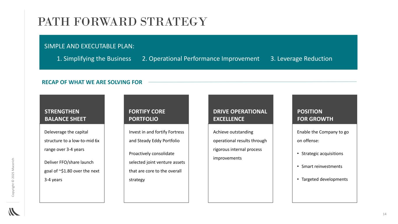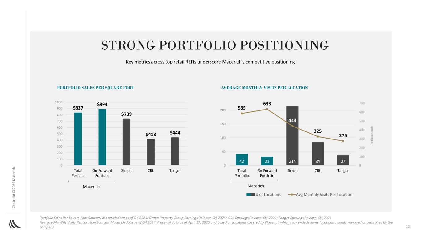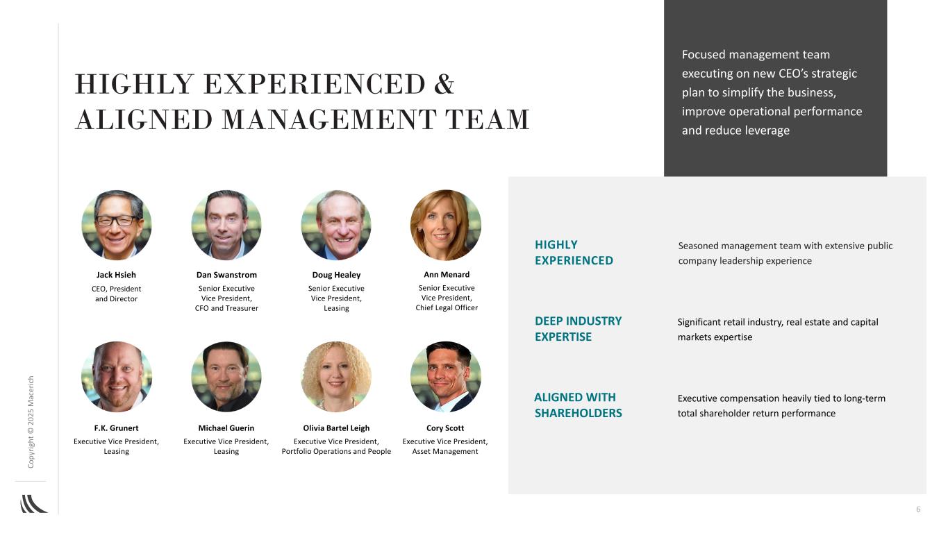 C o p yr ig h t©202 5M AC ER IC H法律免责声明注:本文件包含构成前瞻性陈述的陈述,可以通过使用诸如“将”、“预期”、“备考”、“预期”、“假设”、“相信”、“估计”、“指导”、“潜力”、“目标”、“项目”等词语来识别,与历史事项无关的“预定”和类似表述,包括对公司未来运营结果的预期,包括路径前进计划及其在该计划下实现既定目标的能力,包括增长率、收购和处置目标,以及开发、再开发和扩张活动。请股东注意,任何此类前瞻性陈述都不是对未来业绩的保证,并且涉及风险、不确定性和其他因素,可能导致公司的实际结果、业绩或成就与预期、预期或预测存在重大差异。这些因素包括(其中包括)一般行业,以及全球、国家、区域和地方的经济和商业状况,包括关税和利率上升和通货膨胀的影响,这将(其中包括)影响对零售空间或零售商品的需求、现有和潜在租户的可用性和信誉、锚定或租户破产、关闭、合并或合并、租赁利率、条款和付款、利率上升及其对公司财务状况和经营业绩的影响,包括由于公司未偿浮动利率债务的任何借贷成本增加以及抵押贷款违约、融资和运营费用的可用性、条款和成本;房地产市场的不利变化,其中包括来自其他公司、零售业态和技术的竞争、房地产开发和再开发的风险(包括通胀加剧、供应链中断和施工延误)、收购和处置;任何大流行病、流行病或任何高传染性疾病的爆发对美国的不利影响,区域和全球经济以及公司及其租户的财务状况和经营业绩;房地产投资的流动性;政府的行动和举措(包括立法和监管变化);环境和安全要求;以及恐怖活动或其他暴力行为,这可能会对上述所有因素产生不利影响。读者请参阅公司向美国证券交易委员会提交的各种文件,包括截至2024年12月31日止年度的10-K表格年度报告,以讨论此类风险和不确定性,这些讨论通过引用并入本文。请注意,不要过分依赖这些前瞻性陈述,这些陈述仅在本文件发布之日起生效。公司不打算也不承担任何义务更新任何前瞻性信息以反映本文件日期之后的事件或情况或反映意外事件的发生,除非法律要求这样做。2