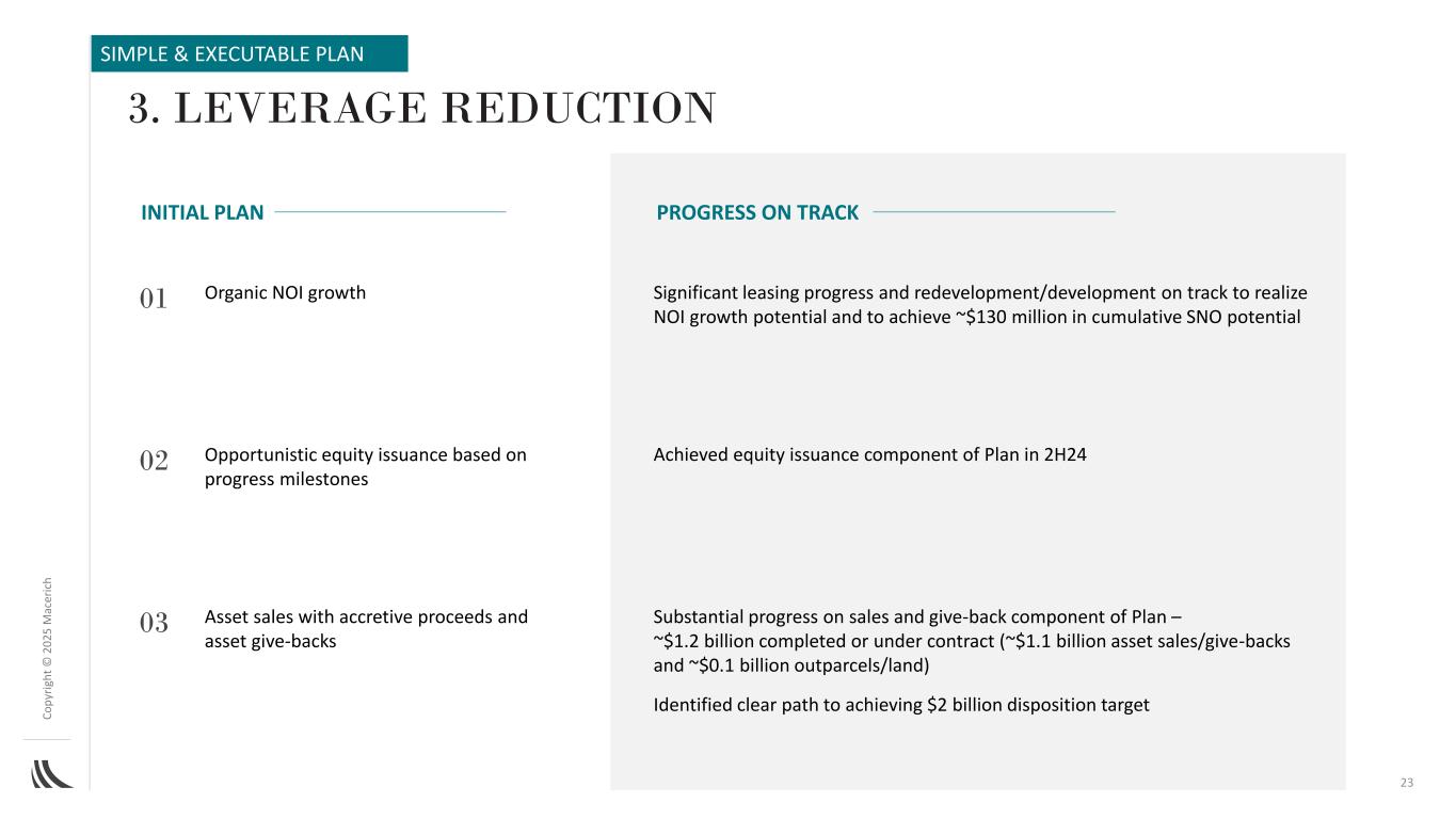 C o p yr ig h t©2025百万AC ER IC H资产出售与增值收益和资产回馈基于进展里程碑的机会性股权发行有机NOI增长在2H24实现了Plan的股权发行部分销售和Plan的回馈部分的实质性进展–已完成或合同中的约12亿美元(约11亿美元的资产出售/回馈和约1亿美元的地块/土地)确定了实现20亿美元处置目标的明确路径显着的租赁进展和重新开发/开发按计划进行,以实现NOI增长潜力并实现累计SNO潜力~1.3亿美元0102033。杠杆削减初步计划在第23轨取得进展简单&可执行计划