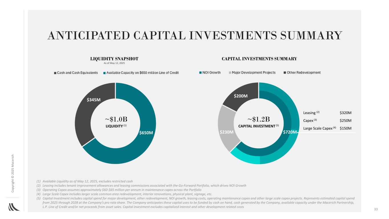 C o p yr ig h t©2025百万AC ER IC H33(1)截至2025年5月12日的可用流动性,不包括受限制的现金(2)租赁包括与Go-Forward投资组合相关的租户改善津贴和租赁佣金,这推动了NOI增长(3)运营资本支出假设整个投资组合每年的维护资本支出约为60-6500万美元(4)大规模资本支出包括更大规模的公共区域重建、内部翻新、实体厂房、标牌等。(5)资本投资包括主要开发、其他重建、NOI增长、租赁成本的资本支出,运营维护资本支出及其他大型资本支出项目。表示2025年至2028年按公司按比例份额计算的估计资本支出。公司预计这些资本用途将由手头现金、公司产生的现金、Macerich Partnership、L.P.信用额度下的可用产能和/或资产出售的净收益提供资金。资本投资不包括资本化利息和其他与开发相关的成本预计资本投资汇总流动性快照6.5亿美元3.45亿美元~1.0b美元流动性(1)截至2025年5月12日租赁(2)3.2亿美元资本支出(3)2.5亿美元大规模资本支出(4)1.5亿美元~1.2B美元资本投资(5)2亿美元7.2亿美元2.3亿美元资本投资汇总