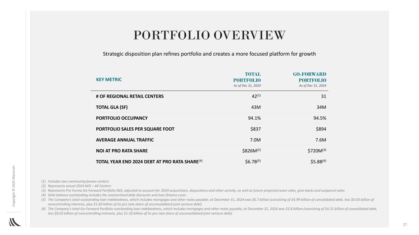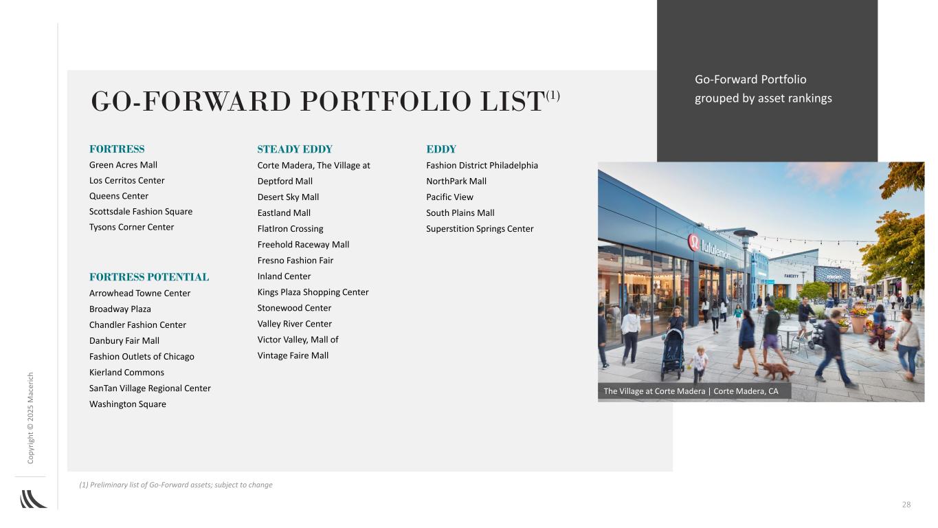 C o p yr ig h t©202 5M AC ER IC H战略处置计划细化投资组合,为增长创造更专注的平台27投资组合概览(1)包括两个社区/权力中心(2)代表2024年实际NOI –所有中心(3)代表备考Go-Forward投资组合NOI,调整后考虑到2024年的收购、处置和其他活动,以及未来预计的资产出售、回馈和外包销售(4)未偿债务余额包括未摊销债务折扣和贷款融资成本(5)公司未偿贷款债务总额,其中包括抵押贷款和其他应付票据,截至2024年12月31日为67亿美元(包括49.9亿美元的合并债务,减去0.03亿美元的非控制性权益,加上16.9亿美元的未合并合资债务按比例份额)(6)截至2024年12月31日,公司Go-Forward投资组合的未偿贷款债务总额,包括抵押贷款和其他应付票据,为58亿美元(包括43.1亿美元的合并债务,减去0.03亿美元的非控制性权益,再加上其未合并合资债务按比例份额的15.0亿美元),截至12月31日的关键指标总投资组合,截至2024年12月31日的2024年GO-FORWARD投资组合#区域零售中心42(1)31总GLA(SF)4300万3400万投资组合占额94.1% 94.5%投资组合销售额每平方英尺837美元894美元平均年交通量700万760万NOI按按按比例份额计算8.26亿美元(2)7.2亿美元(3)2024年年底按比例份额计算的债务总额(4)$ 6.7b(5)$ 5.8b(6)