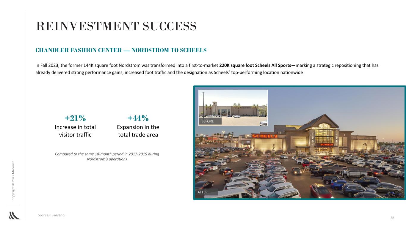 C o p yr ig h t©2025M AC ER IC H 2023年秋季,前144K平方英尺的Nordstrom被改造成首次上市的220K平方英尺的Scheels All Sports ——标志着战略重新定位,该战略已经带来了强劲的业绩增长、增加的客流量以及被指定为Scheels在全国范围内表现最好的地点来源:Placer.ai CHANDLER FASHION CENTER — NORDSTROM to Scheels after + 21%的总客流量增长+ 44%与Nordstrom运营期间的2017-2019年相同的18个月期间相比,总贸易面积扩大38再投资成功