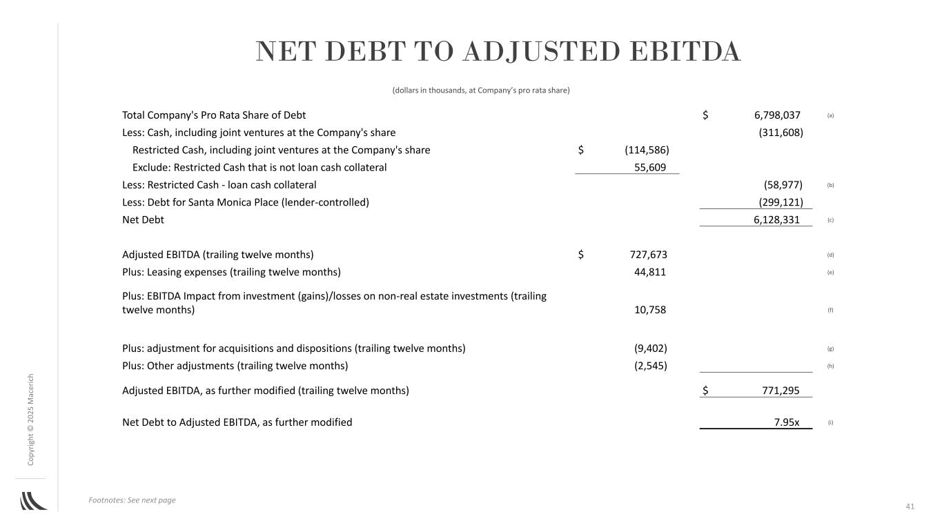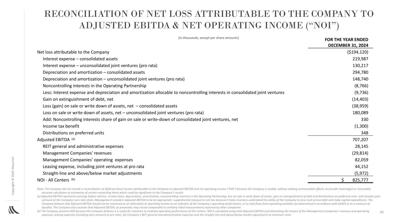 C o p yr ig h t©截至12月31日止年度归属于公司的净亏损与调整后EBITDA &净营业收入(“NOI”)的对账2025 m ac er ic h,2024年归属于公司的净亏损(194,120美元)利息支出–合并资产219,987利息支出–未合并的合资企业(按比例)130,217折旧和摊销–合并资产294,780折旧和摊销–未合并的合资企业(按比例)148,740经营合伙企业中的非控制性权益(8,766)减:利息支出和可分配给合并合资企业中非控制性权益的折旧和摊销(9,736)债务清偿收益,净额(14,403)出售或减记资产的损失(收益),净额–合并资产(38,959)出售或减记资产的损失,净额–未合并合营企业(按比例)180,089加:非控股权益应占合并合营企业的出售或减记收益,净额330所得税优惠(1,300)优先单位的分配348调整后EBITDA(a)707,207 REIT一般和管理费用28,145管理公司的收入(29,814)管理公司的运营费用82,059租赁费用,包括按比例44,152直线及以上/以下市场调整的合资企业(5,972)NOI-所有中心(b)825,777美元注:公司未将归属于公司的2028年净(亏损)收入与调整后EBITDA和净营业收入(“NOI”)进行对账,因为公司无法在不做出不合理努力的情况下,提供对某些对账项目的有意义或合理准确的计算或估计,这些项目可能对公司的业绩产生重大影响(a)调整后EBITDA指扣除利息、所得税、折旧、摊销、经营合伙企业的非控制性权益前的收益,资产出售或减记损失、债务清偿收益和优先股分配,包括按公司比例份额的合资企业。管理层认为调整后的EBITDA是净亏损的适当补充措施,因为它有助于投资者了解公司产生和偿还债务以及进行资本支出的能力。公司认为,调整后的EBITDA不应被解释为替代营业收入作为公司经营业绩的指标,或替代经营活动产生的现金流量(根据公认会计原则确定)或作为流动性的衡量标准。该公司还警告称,调整后的EBITDA,如所示,可能无法与其他公司报告的类似标题的测量结果进行比较(b)该公司提出NOI,因为该公司认为投资者评估这些中心的运营业绩是有用的。NOI的计算方法是使用调整后EBITDA总额,并剔除管理公司的收入和运营费用、租赁费用(包括按比例的合资企业)、公司的REIT一般和管理费用以及对最低租金的直线及以上/以下市场调整(以千为单位,每股金额除外)的影响40