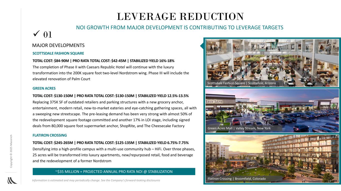 C o p yr ig h t©202 5m AC ER IC H24信息估计,可能会周期性变化。见公司前瞻性披露ScotTSDALE FASHION SQUARE总成本:84-9000万美元|按比例总成本:4200-4500万美元|稳定收益16%-18 %与Caesars Republic Hotel完成的二期将继续进行豪华改造,改造为20万平方英尺的两级Nordstrom翼楼。第三阶段将包括Palm Court GREEN ACRES的高架翻修总成本:1.3-1.5亿美元| PRO RATA总成本:1.3-1.5亿美元|稳定收益率12.5%-13.5 %用新的杂货主播、娱乐、现代零售、新上市的餐馆和引人注目的聚集空间取代37.5万平方英尺的过时零售商和停车结构,所有这些都拥有一览无余的新街景。预租需求一直非常强劲,承诺的重建面积几乎达到50%,另有17%处于意向书阶段,其中包括来自80,000平方英尺超市主播、ShopRite和起司工坊 Flatiron的已签署交易,总成本:2.45-2.65亿美元|专业总成本:1.25-1.35亿美元|稳定收益率6.75%-7.75 %密集成为一个拥有多用途社区枢纽– HiFi的备受瞩目的校园。分三期,25英亩将被改造成豪华公寓、新建/改建零售、食品和饮料以及重建一个前Nordstrom FlatIron Crossing |科罗拉多州布鲁姆菲尔德斯科茨代尔时尚广场|亚利桑那州斯科茨代尔~3500万美元=预计年度PRO RATA NOI @ Stabilization丨01主要开发项目带来的杠杆减少NOI增长正在促进杠杆目标Green Acres Mall | Valley Stream,纽约主要开发项目