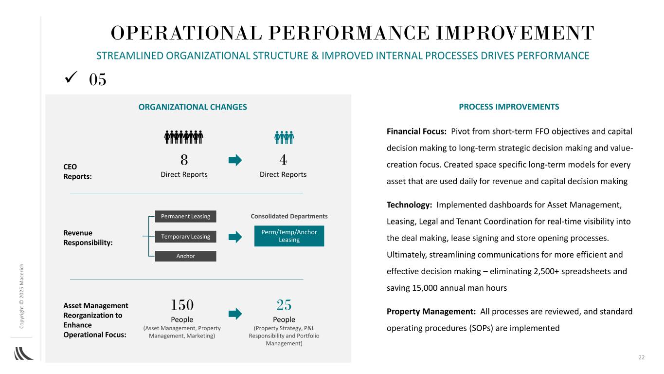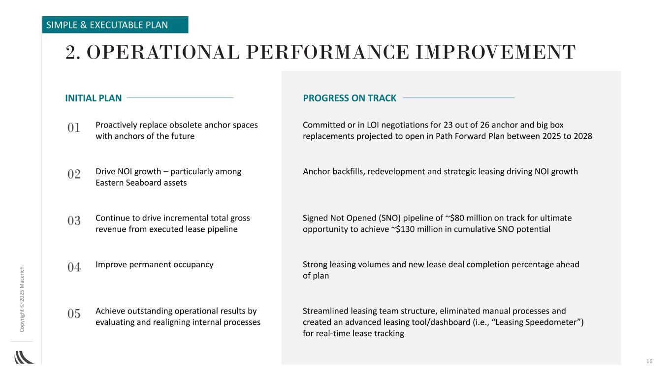 C o p yr ig h t©2025 m AC ER IC H 01020304继续推动来自已执行租赁管道的增量总毛收入推动NOI增长——尤其是在东部Seaboard资产中,主动将过时的锚位替换为未来的锚位16锚位回填,重新开发和战略租赁推动NOI增长强劲的租赁量和新租赁交易提前完成百分比已签署未开放(SNO)约8000万美元的管道有望获得最终机会,实现累计约1.3亿美元的SNO潜力承诺或正在就预计在2025年至2028年期间在Path Forward计划中开放的26个锚点和大盒子更换中的23个进行意向书谈判改善永久占用通过评估和重新调整内部流程实现出色的运营结果精简租赁团队结构、消除人工流程并创建先进的租赁工具/仪表板(即,“租赁速度计”)进行实时租赁跟踪052。运营绩效改进初始计划在简单轨道上的进展&可执行计划