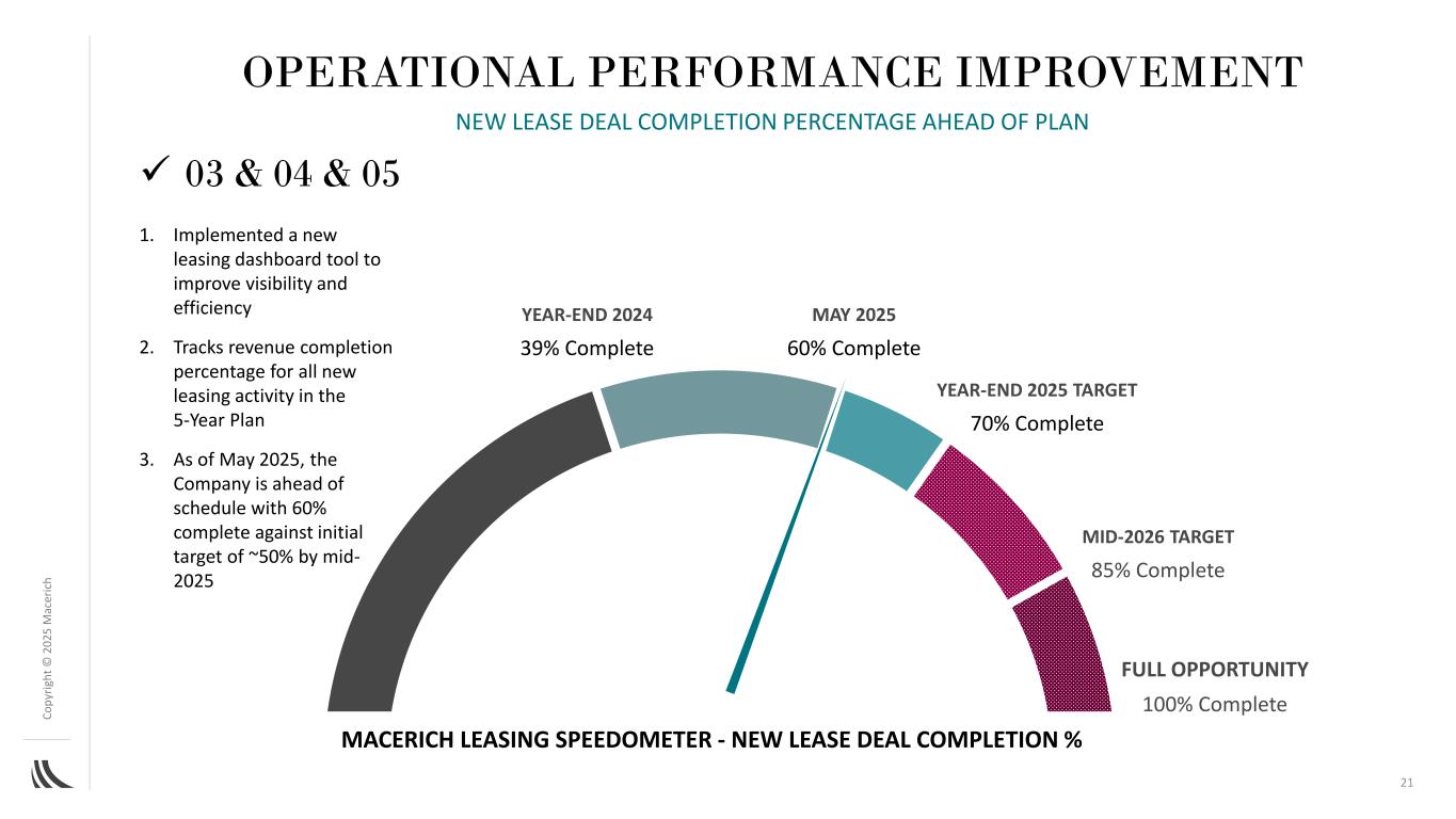 C o p yr ig h t©202 5m ac er ic h 2024年底39%完成2025年5月60%完成2025年底目标70%完成2026年中期目标85%完成充分机会100%完成1。实施了新的租赁仪表板工具,以提高可见度和效率2。跟踪5年计划3中所有新租赁活动的收入完成百分比。截至2025年5月,公司已提前完成60%,而到2025年中期的初步目标为~50% Macerich租赁速度计-新租赁交易完成%经营业绩改善新租赁交易完成百分比提前于计划丨03 & 04 & 0521