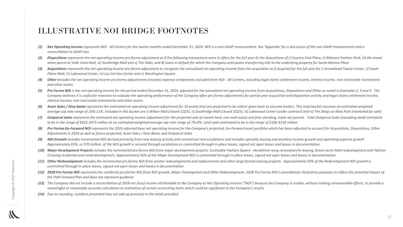 C o p yr ig h t©202 5m ac er ic h Illustrative NOI Bridge脚注(1)净营业收入代表NOI-截至2024年12月31日止十二个月的所有中心。NOI是一种非GAAP衡量标准。有关非GAAP计量的讨论以及与GAAP亏损的对账,请参见“附录”(2)处置代表净营业收入备考调整,如同以下交易在全年有效一样A)i)Country Club Plaza的处置,ii)Biltmore Fashion Park,iii)Valle Vista Mall的独立包裹,iv)Southridge Mall和v)The Oaks;以及b)公司预计将转让Santa Monica Place标的财产所有权的违约贷款(3)收购代表净营业收入备考调整,以确认来自收购的年化净营业收入,如同全年收购i)Arrowhead Towne Center,ii)South Plains Mall,iii)Lakewood Center,iv)Los Cerritos Center和v)Washington Square(4)其他包括NOI中排除的净营业收入备考调整(收入)费用部分-所有中心,包括法律索赔结算收入,利息收入、非房地产投资和其他资产(5)备考NOI是截至2024年12月31日期间的净营业收入,根据脚注2、3和4中所述的收购、处置和其他的年化净营业收入进行调整。公司认为,投资者在对部分年度的收购和处置活动以及法律索赔结算收入、利息收入、非房地产投资和其他资产进行备考调整后评估公司的经营业绩是有用的(6)资产出售/回馈代表预计将出售或回馈给有担保贷款人的10项资产的估计净营业收入调整。这个总桶假设估计的加权平均上限利率范围为10%-11 %。这一桶包括i)Wilton Mall(25年第一季度关闭)、ii)Southridge Mall(25年第二季度关闭)、iii)Lakewood Center(根据合同)和iv)Atlas Park的商店(市场销售)(7)Outpackel sales代表预计出售空置土地、非购物中心资产和独立、三网地块的估计净营业收入调整。Outparcel总销售额(不包括土地)估计在4.25-4.75亿美元之间,估计加权平均上限利率范围为7%-8 %。土地销售估计在1-1.5亿美元范围内(8)Forma Go-Forward NOI代表公司预计、Go-Forward资产组合的2024年调整后基础净营业收入,该资产组合已调整为考虑到收购、处置、2024年的其他调整以及未来的预计,资产销售/回馈和外包销售(9)NOI增长包括主要来自新租赁活动和合同租金上涨的增量NOI,包括专业租赁和辅助收入增长和运营费用增长约65%,即7000万美元,的NOI增长通过升级或通过就地租赁、已签署的未开放租赁和文件中的租赁来保证(10)主要开发项目包括主要开发项目的增量备考NOI:Scottsdale Fashion Square-Nordstrom Wing翻新/再租赁、Green Acres Mall再开发以及FlatIron Crossing住宅和零售开发。约45%的主要发展NOI是通过就地租赁、已签署的非开放租赁和文件中的租赁承诺的(11)其他重建包括来自锚定重建和替换以及其他大业态租赁项目的增量备考NOI。大约50%的重建NOI增长是通过就地租赁、已签署的非开放租赁和文件中的租赁承诺的(12)2028 Pro Forma NOI代表来自NOI增长、主要开发和其他重建的合并备考NOI。提供2028年备考NOI是为了说明目的,以反映路径前进计划的潜在影响,并不代表指导(13)公司没有将归属于公司的2028年净(亏损)收入与净营业收入(“NOI”)进行对账,因为公司无法在不做出不合理努力的情况下,提供对可能对公司业绩产生重大影响的某些调节项目的有意义或合理准确的计算或估计(14)由于四舍五入,所提供的数字加起来可能与所提供的总数不完全一致30