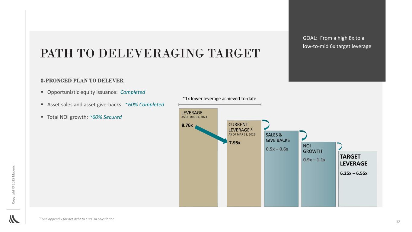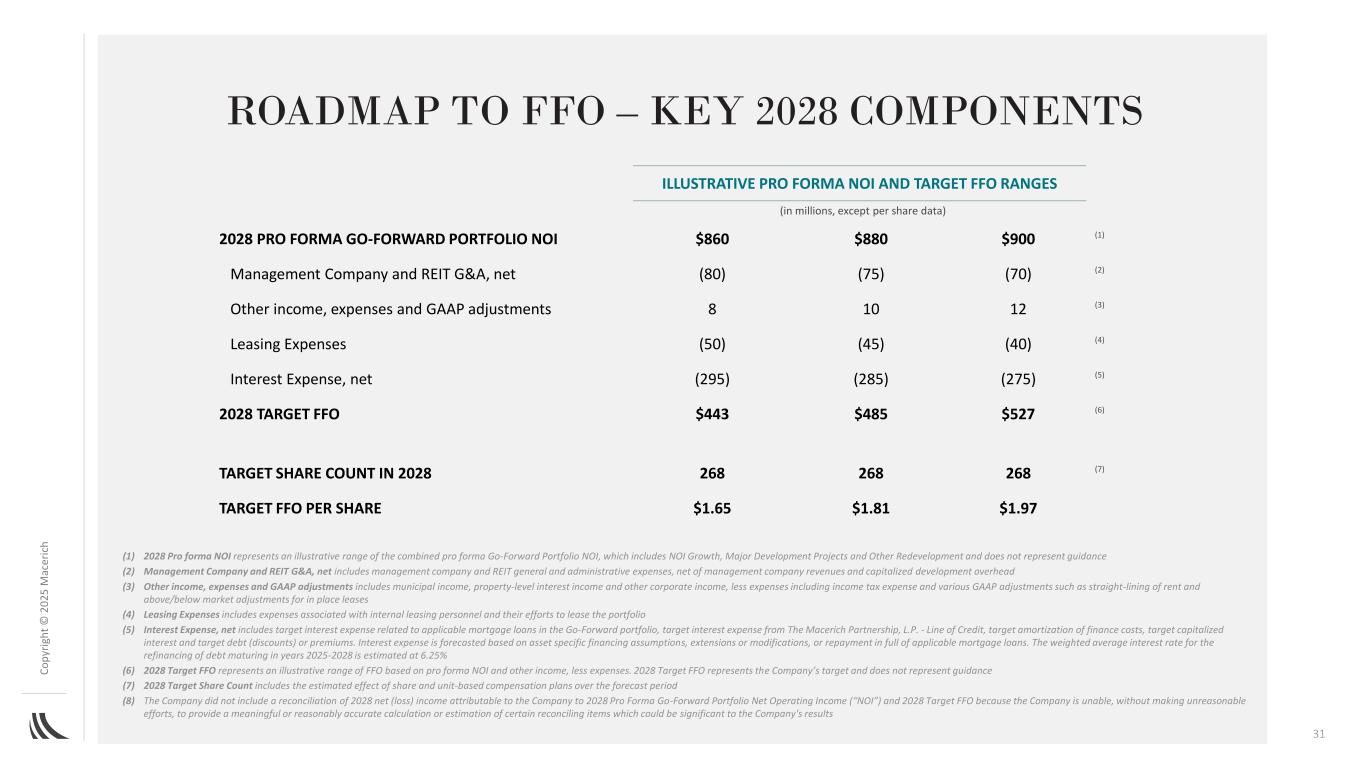 C o p yr ig h t©202 5m ac er ic h 31 ROADMAP to FFO – 2028年关键组成部分图解PRO FORMA NOI和目标FFO范围2028 PRO FORMA GO-FORWARD PORTFOLIO NOI $ 860 $ 880 $ 900(1)管理公司和REIT G & A,净额(80)(75)(70)(2)其他收入、费用和GAAP调整81012(3)租赁费用(50)(45)(40)(4)利息费用,净额(295)(285)(275)(5)2028年目标FFO 443美元485美元527美元(6)2028年目标股数量268268268(7)每股目标FFO 1.65美元1.81美元1.97美元(以百万计,每股数据除外)(1)2028年备考NOI代表合并的备考Go-Forward投资组合NOI的说明性范围,其中包括NOI增长、主要发展项目和其他再发展,不代表指导(2)管理公司和REIT G & A,净额包括管理公司和REIT一般和行政费用,扣除管理公司收入和资本化的开发间接费用(3)其他收入,费用和GAAP调整包括市政收入、财产层面的利息收入和其他公司收入,减去包括所得税费用和各种GAAP调整的费用,例如租金的直线调整和到位租赁的高于/低于市场调整(4)租赁费用包括与内部租赁人员及其租赁投资组合的努力相关的费用(5)利息费用,净额包括与Go-Forward投资组合中适用的抵押贷款相关的目标利息费用、来自马塞里奇房产合伙企业L.P.-信用额度的目标利息费用、融资成本的目标摊销、目标资本化利息和目标债务(折扣)或溢价。利息支出是根据资产特定融资假设、延期或修改、或全额偿还适用的抵押贷款进行预测的。2025-2028年到期债务再融资的加权平均利率估计为6.25%(6)2028年目标FFO代表基于备考NOI和其他收入减去费用的FFO的说明性范围。2028年目标FFO代表公司的目标,不代表指引(7)2028年目标股份数量包括预测期内股份和单位薪酬计划的估计影响(8)公司没有包括归属于公司的2028年净(亏损)收入与2028年备考Go-Forward投资组合净营业收入(“NOI”)和2028年目标FFO的对账,因为公司无法在不做出不合理努力的情况下,提供对某些对账项目的有意义或合理准确的计算或估计,这些项目可能对公司的业绩具有重要意义