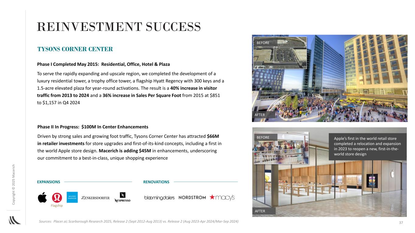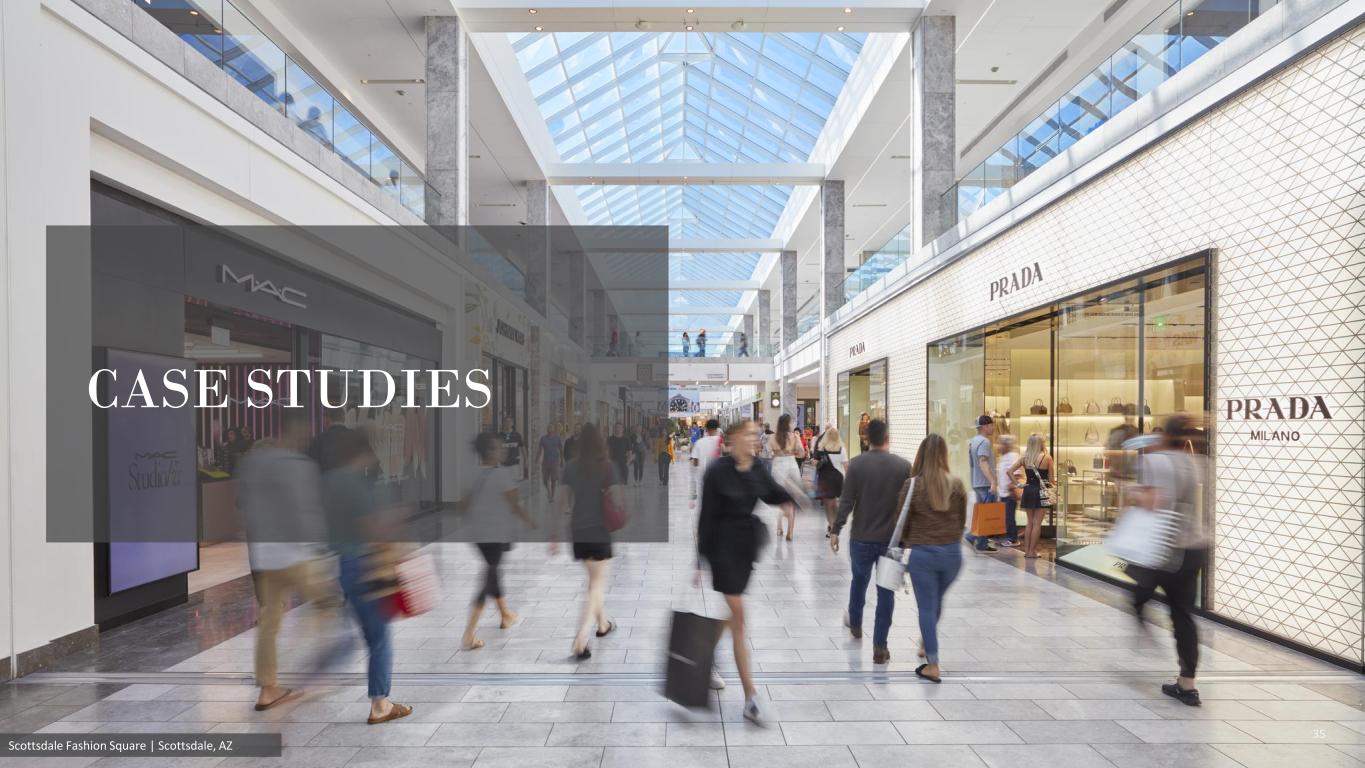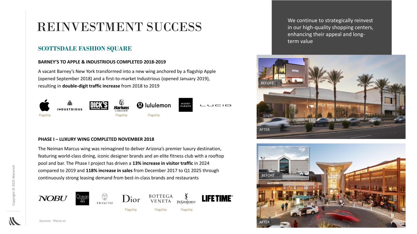 C o p yr ig h t©2025 m ac er ic h after before Phase I – Luxury Wing于2018年11月完成了对Neiman Marcus翼楼的重新构想,以提供亚利桑那州首屈一指的豪华目的地,其中包括世界级的餐饮、标志性的设计师品牌以及带屋顶游泳池和酒吧的精英健身俱乐部。与2019年相比,2024年的一期项目带动了13%的客流量增长,2017年12月至2025年第一季度的销售额增长了118%,这是由于一流品牌和餐厅的持续强劲租赁需求带来的再投资成功ScotTSDALE FASHION SQUARE在BARNEY's to Apple & IndustriIOUS之前完成了2018-2019年空置的Barney’s New York改造成新的侧翼,由旗舰苹果(2018年9月开业)和率先上市的Industrious(2019年1月开业)锚定,导致2018年至2019年两位数的流量增长旗舰旗舰旗舰旗舰旗舰我们继续对我们的优质购物中心进行战略性再投资,增强其吸引力和长期价值36来源:PLACER.AI