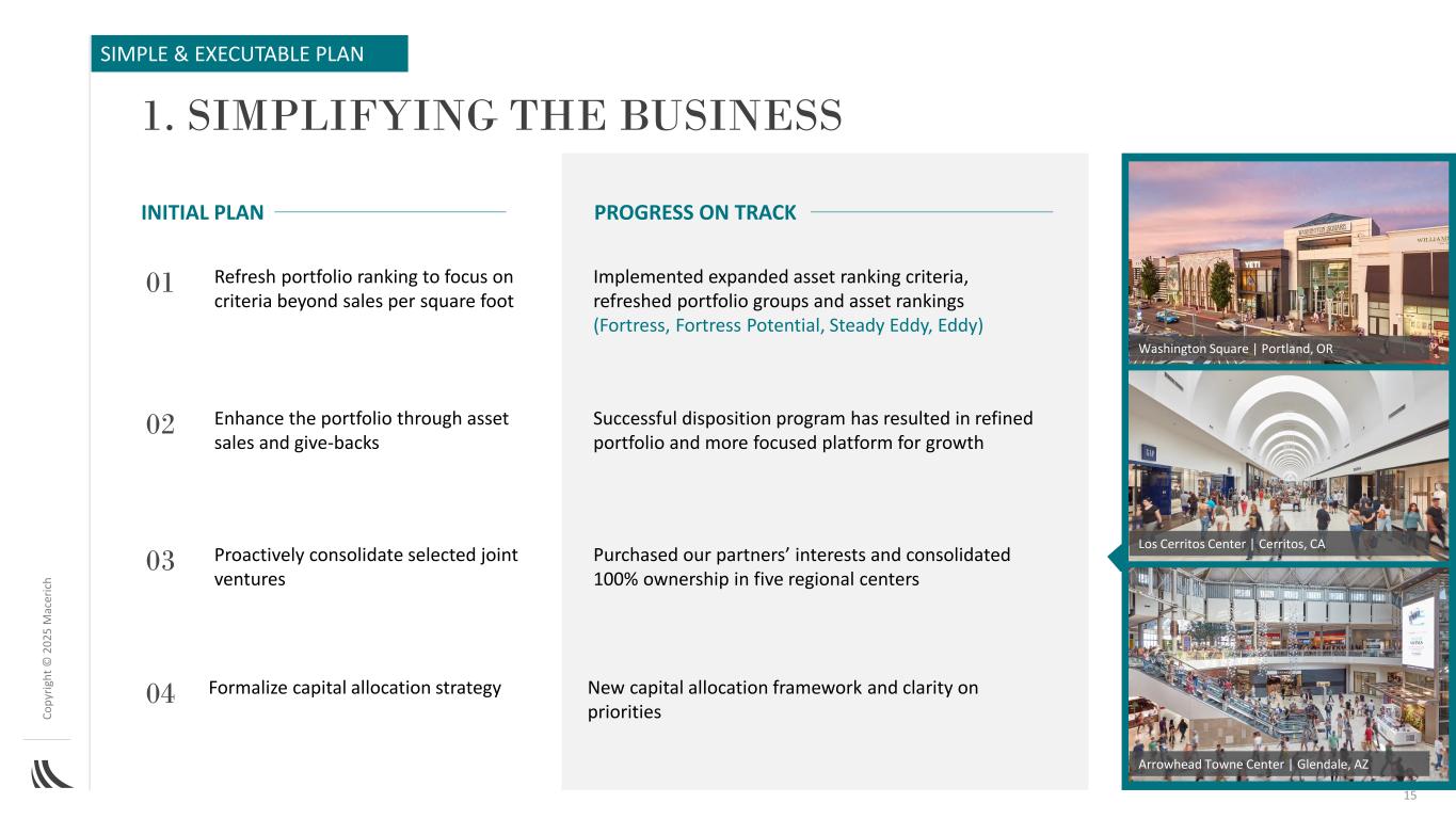 C o p yr ig h t©2025 m ac er ic h strengthen balance sheet path forward strategy 14 recap of what we are solving for fortify core portfolio drive operational excellence position for growth deleverage the capital structure to a low to medium 6x range over 3-4 years deliver FFO/share launch goal~$ 1.80 in the next 3-4 years invest and strengthen Fortress and Steady Eddy Portfolio proactively consolidate selected joint venture assets是整体战略的核心通过严格的内部流程改进实现出色的运营结果使公司能够继续进攻:•战略收购•明智的再投资•有针对性的发展简单且可执行的计划:1。简化业务2。运营绩效改善3。降杠杆