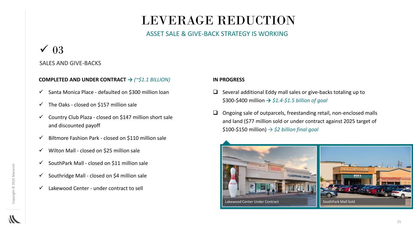C o p yr ig h t©202百万AC ER IC H杠杆削减完成并已签约→(~11亿美元)丨Santa Monica Place-拖欠3亿美元贷款丨The Oaks-完成1.57亿美元的出售丨Country Club Plaza-完成1.47亿美元的卖空交易和折扣回报丨比尔特莫尔时尚公园-以1.1亿美元的销售额结束丨威尔顿购物中心-以2500万美元的销售额结束丨南公园购物中心-以1100万美元的销售额结束丨南岭购物中心-以400万美元的销售额结束丨莱克伍德中心-根据合同进行销售丨额外的Eddy购物中心销售额或回馈总额高达3亿至4亿美元→目标为1.4-15亿美元丨正在进行的外包销售,独立零售,非封闭式购物中心和土地(7700万美元已售出或正在签约,而2025年目标为1-1.5亿美元)→ 20亿美元最终目标Lakewood Center根据合同SouthPark Mall已售出销售和回馈丨03资产出售和回馈战略正在发挥作用25