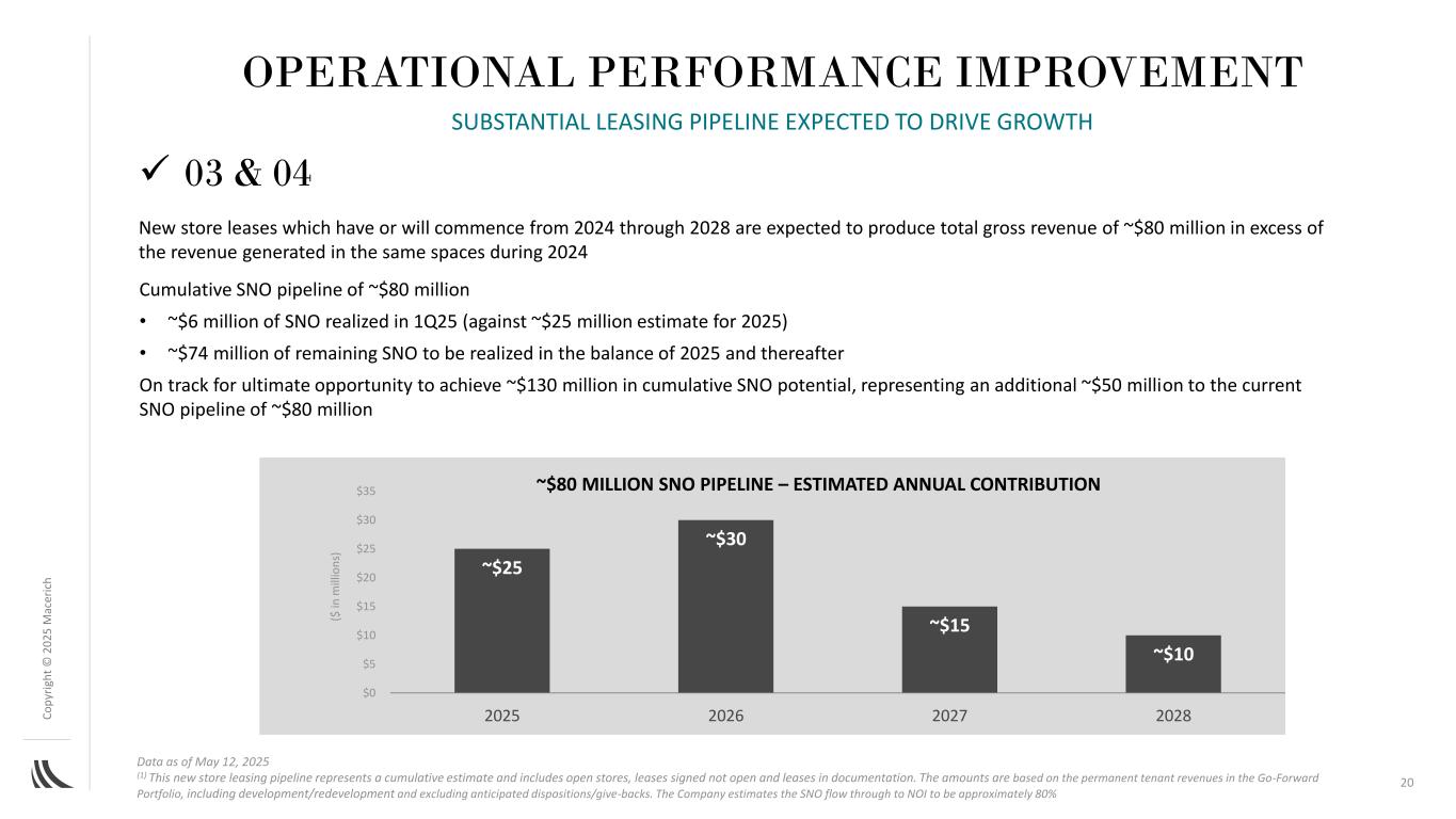 C o p yr ig h t©2024至2028年已经或即将开始的202百万AC ER IC h丨03 & 04新店租赁预计将产生约8000万美元的总毛收入,超过2024年期间相同空间产生的收入~25美元~30美元~15美元~10美元0美元5美元10美元15美元20美元20美元25美元30美元35美元2025202620272028(百万美元)累计SNO管道约8000万美元• 1Q2实现SNO约600万美元(相对于约2500万美元的估计2025年)•约7400万美元的剩余SNO将在2025年剩余时间内实现,此后有望获得最终机会,以实现约1.3亿美元的累计SNO潜力,相当于目前约8000万美元的SNO管道的额外约5000万美元截至2025年5月12日的数据(1)这一新的商店租赁管道代表累计估计,包括开放商店、签署的未开放租约和文件中的租约。这些金额基于Go-Forward投资组合中的永久租户收入,包括开发/再开发,不包括预期处置/回馈。该公司估计,SNO流向NOI的流量约为80%的运营绩效改善实质性租赁管道预计将推动增长~8000万美元SNO管道–估计年度贡献20
