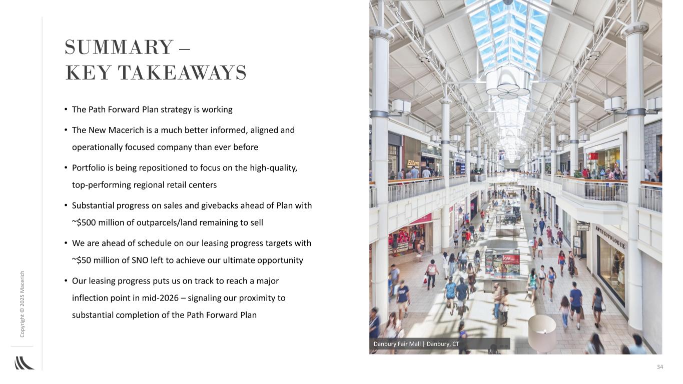 C o p yr ig h t©2025 M AC ER IC H Summary – Key TAKEAWAYS • Path Forward Plan战略正在发挥作用•新Macerich是一家比以往任何时候都更加知情、一致且专注于运营的公司•投资组合正在重新定位,以专注于高质量、表现最佳的区域零售中心•销售和提前回馈取得实质性进展,剩余约5亿美元的外包地块/土地待售•我们提前实现了租赁进度目标,还剩下约5000万美元的SNO,以实现我们的最终机会•我们的租赁进度使我们有望在2026年年中达到一个重大拐点——这标志着我们即将实质性完成路径前进计划Danbury Fair Mall |康涅狄格州丹伯里34