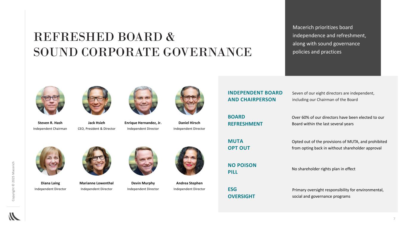 C o p yr ig h t©202 5M AC ER IC H6高度经验丰富且齐心协力的管理团队让管理团队专注于执行新CEO的战略计划,以简化业务、提高运营绩效并降低杠杆率Jack Hsieh首席执行官、总裁兼董事Doug Healey高级执行副总裁、租赁Ann Menard高级执行副总裁、首席法务官F.K. Grunert执行副总裁、租赁Michael Guerin执行副总裁、租赁Olivia Bartel Leigh执行副总裁、投资组合运营和人事Cory Scott执行副总裁,资产管理公司Dan Swanstrom高级执行副总裁、首席财务官兼司库经验丰富的管理团队,拥有丰富的上市公司领导经验,经验丰富,具有重要的零售行业、房地产和资本市场专业知识深度行业专业知识高管薪酬与长期股东总回报表现密切相关,与股东保持一致