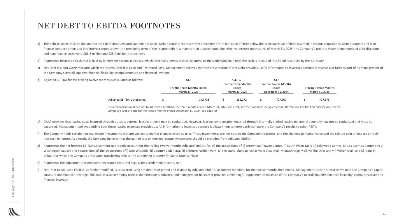 C o p yr ig h t©202百万AC ER IC H净债务对EBITDA脚注a)债务余额包括未摊销的债务贴现和贷款融资成本。债务贴现是指债务的公允价值低于在各种收购中承担的债务本金价值的不足。债务贴现和贷款融资成本按近似实际利率法在相关债务剩余期限内摊销为利息费用。截至2025年3月31日,公司按比例分摊的未摊销债务折扣和贷款融资成本分别为6680万美元和2800万美元b)代表贷方出于各种目的持有的受限制现金,在借款人将现金收回为流动资源之前,这些现金实际上充当了基础贷款的现金抵押品c)净债务是一种非公认会计原则的衡量标准,代表债务减去现金和受限制现金。管理层认为,净债务的列报为投资者提供了有用的信息,因为它将净债务作为其对公司整体流动性、财务灵活性、资本结构和财务杠杆的管理的一部分进行审查d)过去12个月的调整后EBITDA计算如下:e)GAAP规定,通过外部、外部租赁经纪人产生的租赁成本可能被资本化。但是,通过内部配备人员的租赁人员发生的租赁补偿一般不能资本化,必须费用化。管理层认为,加回这些租赁费用为投资者提供了有用的信息,因为这使他们能够更容易地将公司的业绩与其他REIT的f)进行比较。公司持有的某些非房地产投资每季度都会受到市场变化的影响。这些投资不是公司业务的核心,市值变动和相关损益完全属于非现金性质。因此,公司认为非房地产投资的收益或损失应从调整后EBITDA中排除g)代表远期EBITDA调整净额,以适当考虑过去12个月的调整后EBITDA:a)收购:i)Arrowhead Towne Center,ii)South Plains Mall;iii)Lakewood Center,iv)Los Cerritos Center和v)Washington Square和Square Too;b)i)One Westside,ii)Country Club Plaza,iii)Biltmore Fashion Park,iv)Valle Vista Mall的独立包裹,v)Southridge Mall,vi)The Oaks and vii)Wilton Mall;以及c)公司预计将转让Santa Monica Place标的财产所有权的违约贷款h)代表对员工遣散费和法律索赔结算收入的调整,净额i)经进一步修改的调整后EBITDA的净债务是使用截至期末的净债务除以经进一步修改的截至该日止十二个月的调整后EBITDA计算得出的。管理层使用这一比率来评估公司的资本结构和财务杠杆。这一比率在公司所处行业中也普遍使用,管理层认为,这为衡量公司的整体流动性、财务灵活性、资本结构和财务杠杆提供了有意义的补充衡量标准加:减:加:截至截至截至十二个月的三个月截至2025年3月31日、2024年3月31日、2024年12月31日、2025年3月31日的调整后EBITDA,截至2025年3月31日和2024年3月31日的三个月净亏损与调整后EBITDA的对账为172,738美元152,272美元707,207美元727,673美元,见公司补充资料。关于公司网站上的2025年第一季度和截至2024年12月31日止十二个月,见第40页42