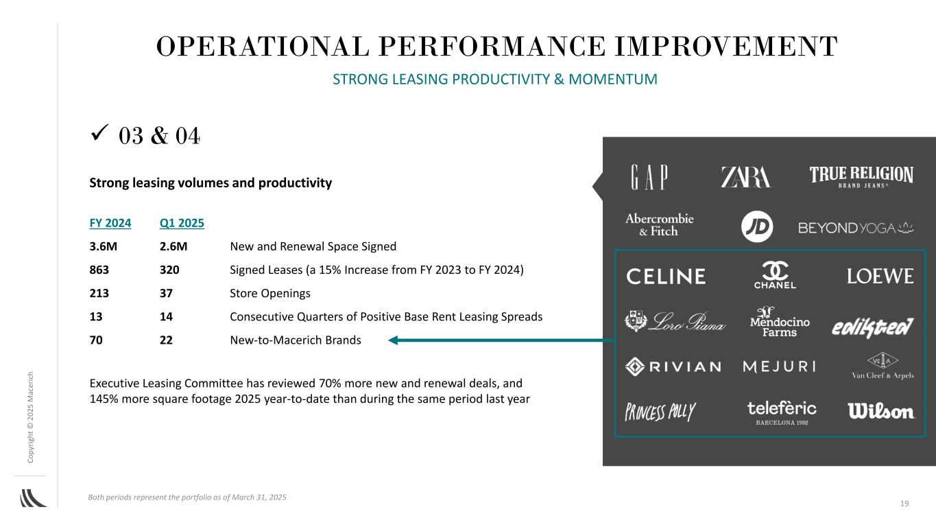 C o p yr ig h t©202 5m AC ER IC H TYSONS Corner Centre Tysons,Virginia Tysons Corner Center巩固了其作为零售强国的地位,我们继续提升中心西区:将从Bloomingdale’s到Macy’s的购物者体验重新想象成一个充满活力且适合步行的零售、餐饮和娱乐区,以高档餐饮和豪华市场为基础东区:公共区域项目完成。体验驱动的娱乐Level 99,广受欢迎的家庭餐饮选择Maggiano’s和起司工坊,一流的零售等等18 West End Future East End after before before案例分析:Tysons Corner Center的战略重新开发丨02运营绩效改进战略重新开发有望推动NOI增长