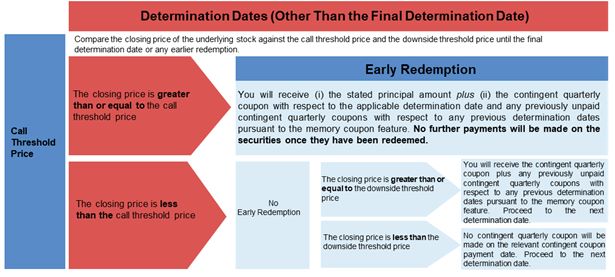 若最终确定日以外的任何确定日标的股票收盘价为大于等于认购门槛价格,证券将自动赎回,每份证券的金额等于紧接相关确定日期后的第一个或有息票支付日的提前赎回付款。一旦赎回证券,将不会再支付任何款项。