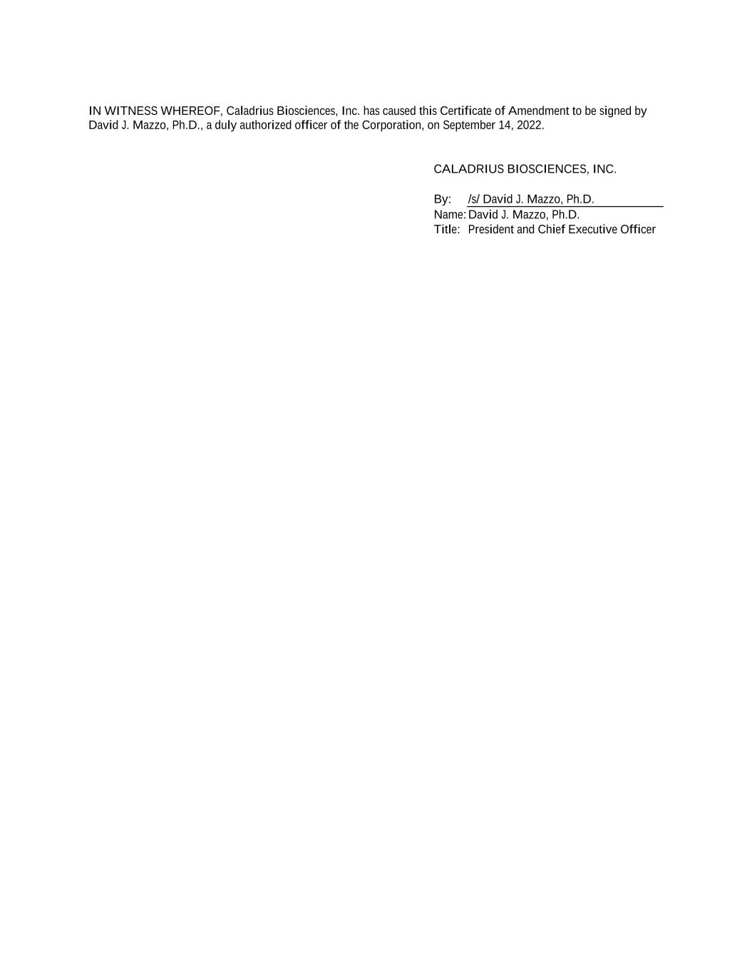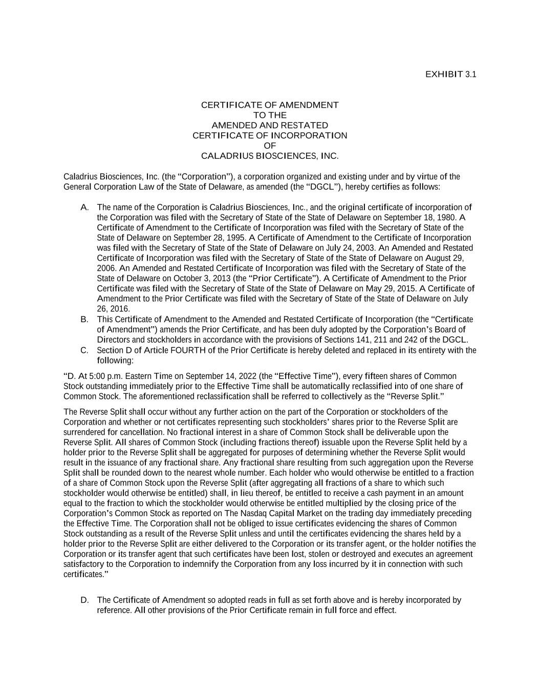 附件 3.1经修订及重述的公司注册证书的修订证书0Caladrius Biosciences, Inc.(“公司”)是一家根据经修订的特拉华州一般公司法(“DGCL”)组建和存在的公司,特此证明如下:A.公司名称为Caladrius Biosciences, Inc.,公司的原始注册证书已于1980年9月18日提交给特拉华州州务卿。1995年9月28日,公司注册证书的修订证书已提交给特拉华州州务卿。公司注册证书的修订证书已于2003年7月24日提交给特拉华州州务卿。2006年8月29日,向特拉华州州务卿提交了一份经修订和重述的公司注册证书。经修订和 重述的公司注册证书已于2013年10月3日提交给特拉华州州务卿(“先前证书”)。2015年5月29日,已向特拉华州州务卿提交了对先前证书的修订证书。2016年7月26日,已向特拉华州州务卿提交了对先前证书的修订证书。B.本经修订和重述的公司注册证书的修订证书(“修订证书”)对先前的证书进行了修订,并已由公司董事会和股东根据第141、211条的规定正式通过和DGCL的242。C.特此删除先前证书第四条D节并全部替换为以下内容:“D.下午5:00东部时间2022年9月14日(“生效时间”),紧接在此之前发行的每15股普通股 生效时间应自动重新分类为一股普通股。上述重分类统称为“反向拆分”。”反向拆分将在公司或公司股东不采取任何进一步行动的情况下进行,无论在反向拆分之前代表此类股东股份的证书是否已交出以取消。反向拆分时不得交付普通股的零碎权益。持有人在反向拆分之前持有的反向拆分时可发行的所有普通股(包括其零碎)应汇总,以确定反向拆分是否会导致发行任何零碎股份。反向拆分时因此类汇总而产生的任何零碎份额应四舍五入到最接近的整数。否则将有权获得一小部分普通股的每个持有人 反向拆分时的股票(在汇总该股东本来有权获得的所有部分股份后)应代替,有权获得现金付款,其金额等于股东本来有权获得的部分乘以紧接生效时间前一个交易日在纳斯达克资本市场上报告的公司普通股收盘价。公司没有义务发行证明因反向拆分而发行的普通股股份的证书,除非直到证明持有人在反向拆分之前持有的股份的证书交付给公司或其转让代理人,或者持有人通知公司或其转让代理人该等证书已丢失,被盗或毁坏,并签署一份令公司满意的协议,以赔偿公司在以下方面遭受的任何损失 与此类证书的联系。”D.如此通过的修订证书全文如上文所述,并在此通过引用并入。先前证书的所有其他规定仍然完全有效。