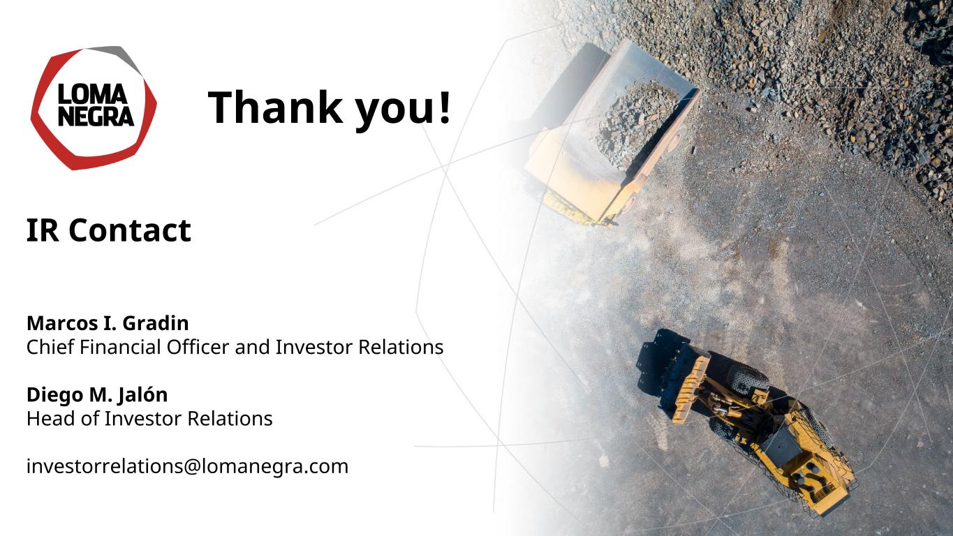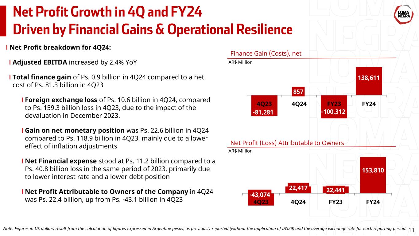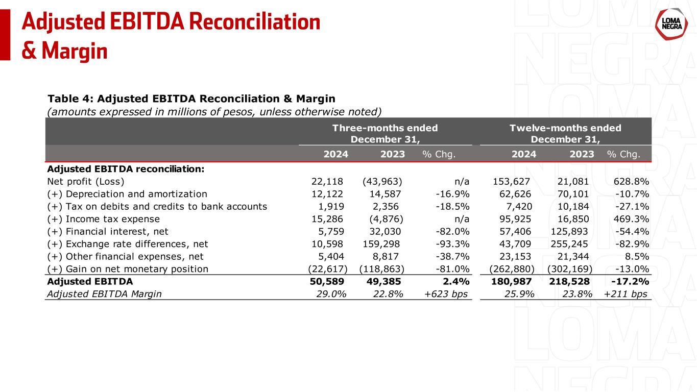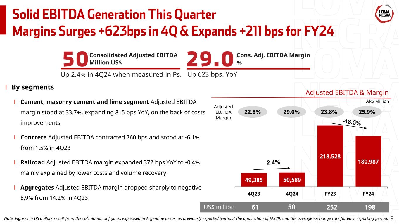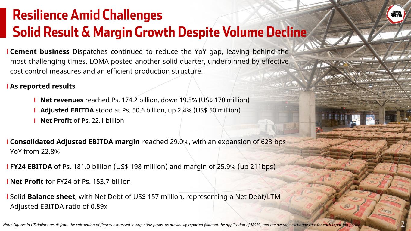 在挑战中保持韧性尽管销量下降,但业绩和利润率仍实现增长水泥业务调度继续缩小同比差距,将最具挑战性的时期抛在身后。LOMA在有效的成本控制措施和高效的生产结构的支持下,又实现了一个稳健的季度。正如报告的结果,净收入达到PS。1742亿,下降19.5%(1.7亿美元)调整后EBITDA为PS。506亿,同比增长2.4%(0.5亿美元)净利润PS。221亿合并调整后EBITDA利润率达到29.0%,同比扩张623个基点,FY24 EBITDA为22.8% PS。1810亿(1.98亿美元)和25.9%的利润率(上升211bps)的24财年净利润PS。1537亿稳健资产负债表,净债务1.57亿美元,净债务/LTM调整后EBITDA比率为0.89x注:美元数字是根据先前报告(未应用IAS29)和每个报告期的平均汇率计算得出的以阿根廷比索表示的数字计算得出的结果。2
