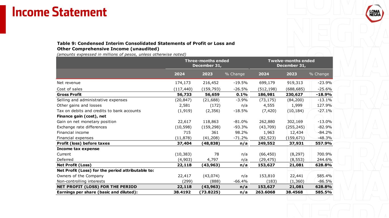 损益表(金额以百万比索表示,除非另有说明)2024203%变动2024203%变动净营收174,173216,452-19.5 % 699,179919,313-23.9 %销售成本(117,440)(159,793)-26.5 %(512,198)(688,685)-25.6 %毛利56,73356,6590.1% 186,981230,627-18.9 %销售和管理费用(20,847)(21,688)-3.9 %(73,175)(84,200)-13.1 %其他损益2,581(172)n/a 4,5551,999127.9%银行账户的借方和贷项税(1,919)(2,356)-18.5 %(7,420)(10,184)-2净货币头寸净收益22,617118,863-81.0 % 262,880302,169-13.0 %汇差(10,598)(159,298)-93.3 %(43,709)(255,245)-82.9 %财务收入71536198.2% 1,96312,434-84.2 %财务费用(11,878)(41,208)-71.2 %(82,523)(159,671)-48.3 %税前利润(亏损)37,404(48,838)不适用249,55237,931557.9%所得税费用当期(10,383)78不适用(66,450)(8,297)700.9%递延(4,903)4,797不适用(29,475)(8,553)244.6%净利润(亏损)22,118(43,期内归属于:公司拥有人22,417(43,074)不适用153,81022,441585.4%非控股权益(299)(888)-66.4 %(183)(1,360)-86.5 %期内纯利(亏损)22,118(43,963)不适用153,62721,081628.8%每股盈利(基本及摊薄):38.4 192(73.82 25)不适用263.606838.4568585.5%表9:简明中期综合损益及其他全面收益报表(未经审核)截至12月31日止三个月,截至12月31日止十二个月,