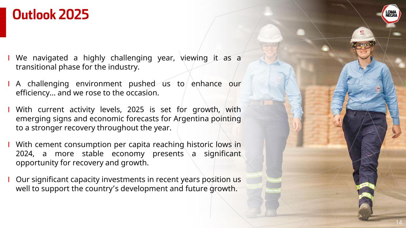 展望2025我们度过了极具挑战性的一年,将其视为行业的过渡阶段。充满挑战的环境促使我们提高效率……我们迎难而上。以目前的活动水平,2025年将迎来增长,新出现的迹象和对阿根廷的经济预测表明,全年将出现更强劲的复苏。随着2024年人均水泥消费量达到历史低点,更稳定的经济为复苏和增长提供了重要机会。我们近年来的重大产能投资使我们能够很好地支持国家的发展和未来增长。14