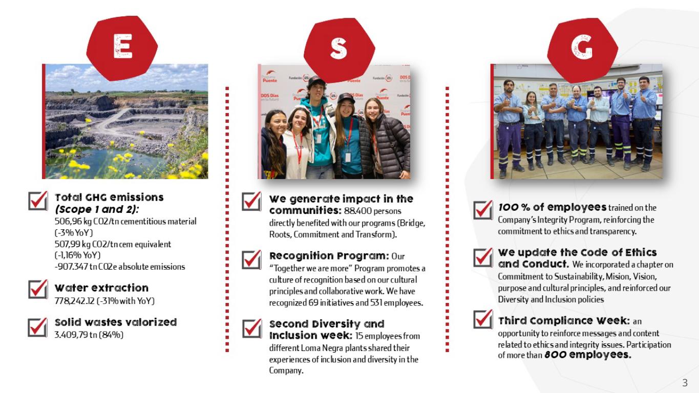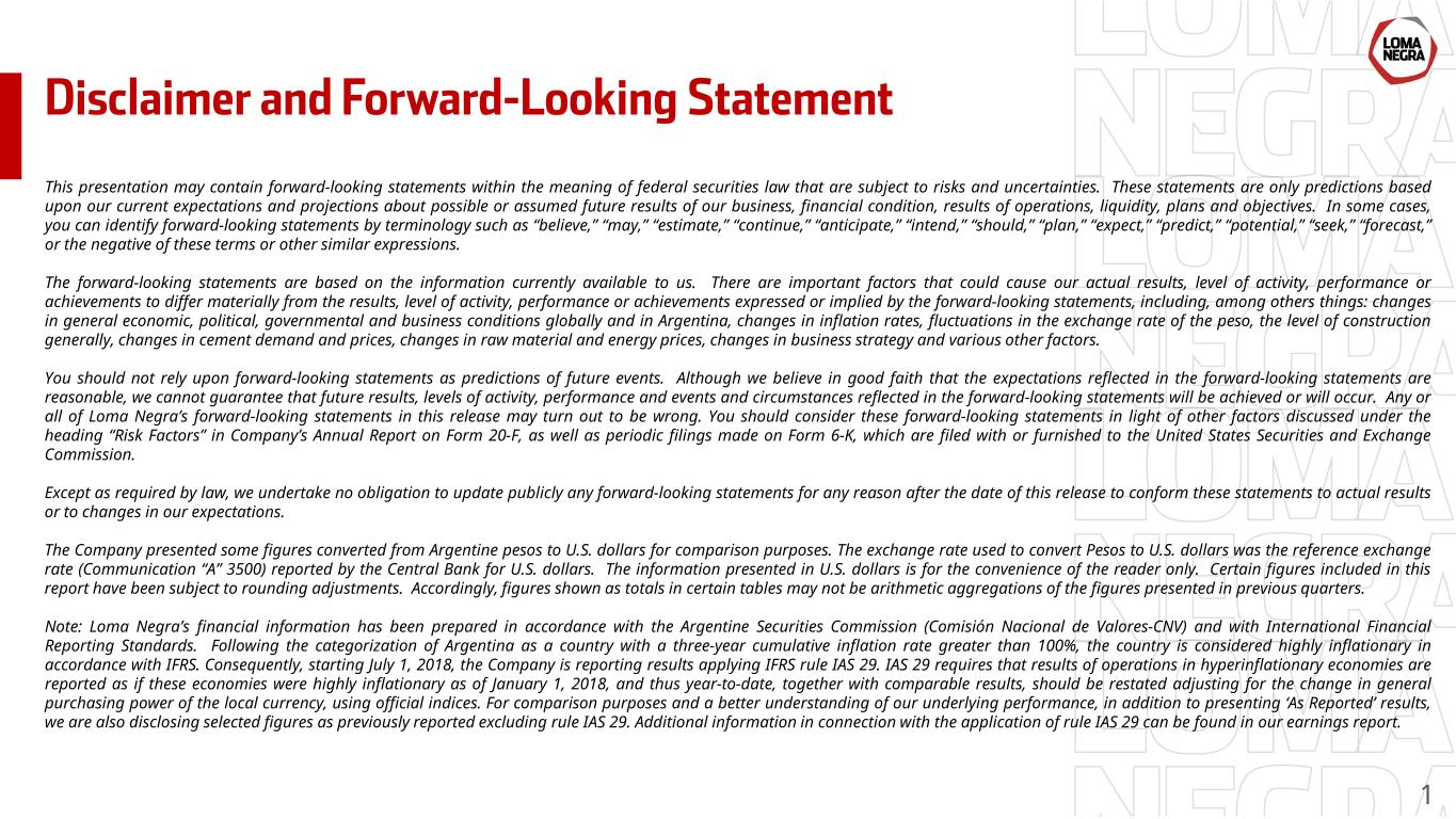 免责声明和前瞻性陈述本演示文稿可能包含联邦证券法含义内的前瞻性陈述,这些陈述受到风险和不确定性的影响。这些陈述仅是基于我们当前对我们业务的可能或假定的未来结果、财务状况、运营结果、流动性、计划和目标的预期和预测的预测。在某些情况下,您可以通过诸如“相信”、“可能”、“估计”、“继续”、“预期”、“打算”、“应该”、“计划”、“预期”、“预测”、“潜在”、“寻求”、“预测”或这些术语的否定或其他类似表达等术语来识别前瞻性陈述。这些前瞻性陈述基于我们目前可获得的信息。有一些重要因素可能导致我们的实际结果、活动水平、业绩或成就与前瞻性陈述中明示或暗示的结果、活动水平、业绩或成就存在重大差异,除其他外,包括:全球和阿根廷总体经济、政治、政府和商业状况的变化、通货膨胀率的变化、比索汇率的波动、总体建筑水平、水泥需求和价格的变化、原材料和能源价格的变化、商业战略的变化以及各种其他因素。你不应该依赖前瞻性陈述作为对未来事件的预测。尽管我们真诚地相信前瞻性陈述中反映的预期是合理的,但我们不能保证前瞻性陈述中反映的未来结果、活动水平、业绩以及事件和情况将会实现或将会发生。Loma Negra在本新闻稿中的任何或所有前瞻性陈述可能被证明是错误的。您应该结合公司年度报告表格20-F中“风险因素”标题下讨论的其他因素,以及向美国证券交易委员会提交或提供的表格6-K定期提交的文件,考虑这些前瞻性陈述。除法律要求外,我们不承担在本新闻稿发布之日后以任何理由公开更新任何前瞻性陈述的义务,以使这些陈述符合实际结果或我们预期的变化。该公司提出了一些从阿根廷比索换算成美元的数字,以便进行比较。将比索兑换成美元所使用的汇率是央行报告的美元参考汇率(Communication“A”3500)。以美元呈现的信息,仅为方便读者使用。本报告所载的某些数字已作四舍五入调整。因此,某些表格中显示为总数的数字可能不是前几个季度所列数字的算术汇总。注:Loma Negra的财务资料按照阿根廷证券委员会(Comisi ó n Nacional de Valores-CNV)和国际财务报告准则编制。继阿根廷被归类为三年累计通胀率高于100%的国家后,根据国际财务报告准则,该国被视为高度通胀。因此,自2018年7月1日起,公司将应用IFRS规则IAS 29报告业绩。国际会计准则第29号要求,报告恶性通货膨胀经济体的运营结果,就好像这些经济体截至2018年1月1日处于高度通货膨胀状态一样,因此,年初至今,连同可比结果,应使用官方指数根据当地货币的一般购买力变化进行调整,进行重述。为了进行比较和更好地了解我们的基本业绩,除了呈现‘报告时’的结果外,我们还披露了先前报告的选定数字,不包括规则IAS 29。有关适用规则IAS 29的更多信息,请参见我们的收益报告。1