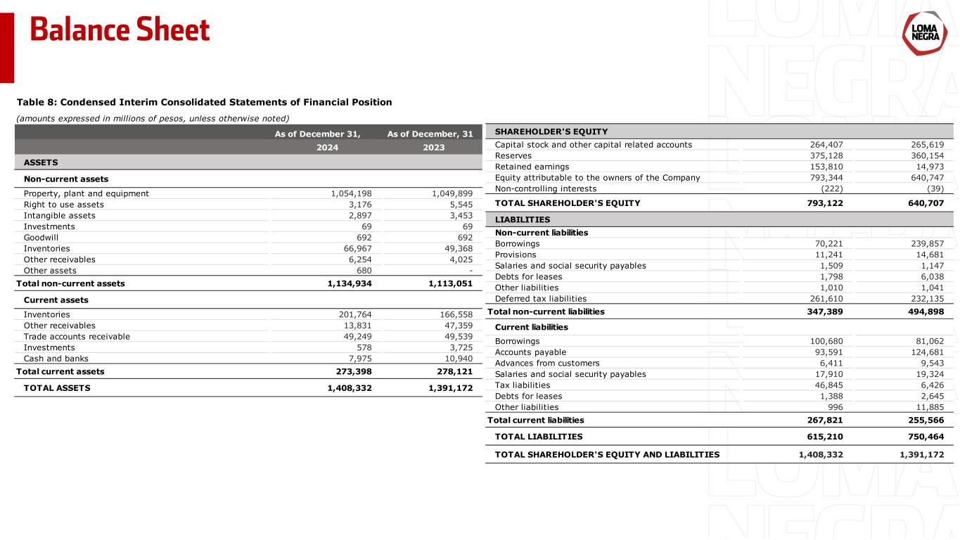 资产负债表截至12月31日止3120242023资产非流动资产物业、厂房及设备1,054,1981,049,899使用权资产3,1765,545无形资产2,8973,453投资6969商誉692692存货66,96749,368其他应收款6,254,025其他资产680-非流动资产总额1,134,9341,113,051流动资产存货201,764166,558其他应收款13,83147,359贸易应收账款49,24949,539投资5783,725现金和银行7,97510,940流动资产总额273,398278,121总资产1,408,3321,391,172表8:简明中期综合财务状况表(金额以百万比索表示,除非另有说明)股东权益股本及其他资本相关账户264,407265,619准备金375,128360,154留存收益153,81014,973归属于公司所有者的权益793,344640,747非控股权益(222)(39)股东权益合计793,122640,707负债非流动负债借款70,221239,857备抵11,24114,681应付工资和社保1,5091,147租赁债务1,7986,038其他负债1,0101,041递延所得税负债261,610232,135非流动负债合计347,389494,898流动负债借款100,68081,062应付账款93,591124,681垫款应付社保17,91019,324税项负债46,8456,426租赁债务1,3882,645其他负债99611,885流动负债总额267,821255,566负债总额615,210750,464股东权益负债总额1,408,3321,391,172