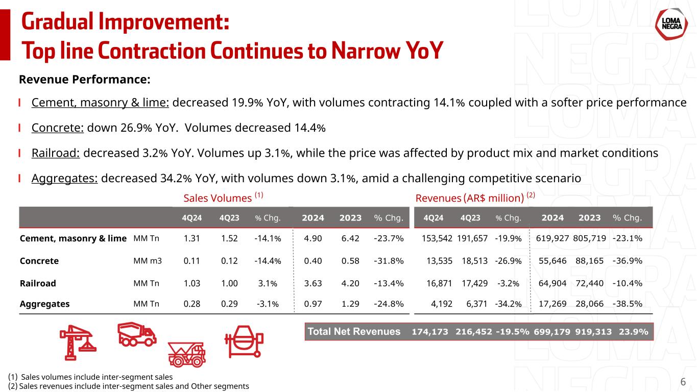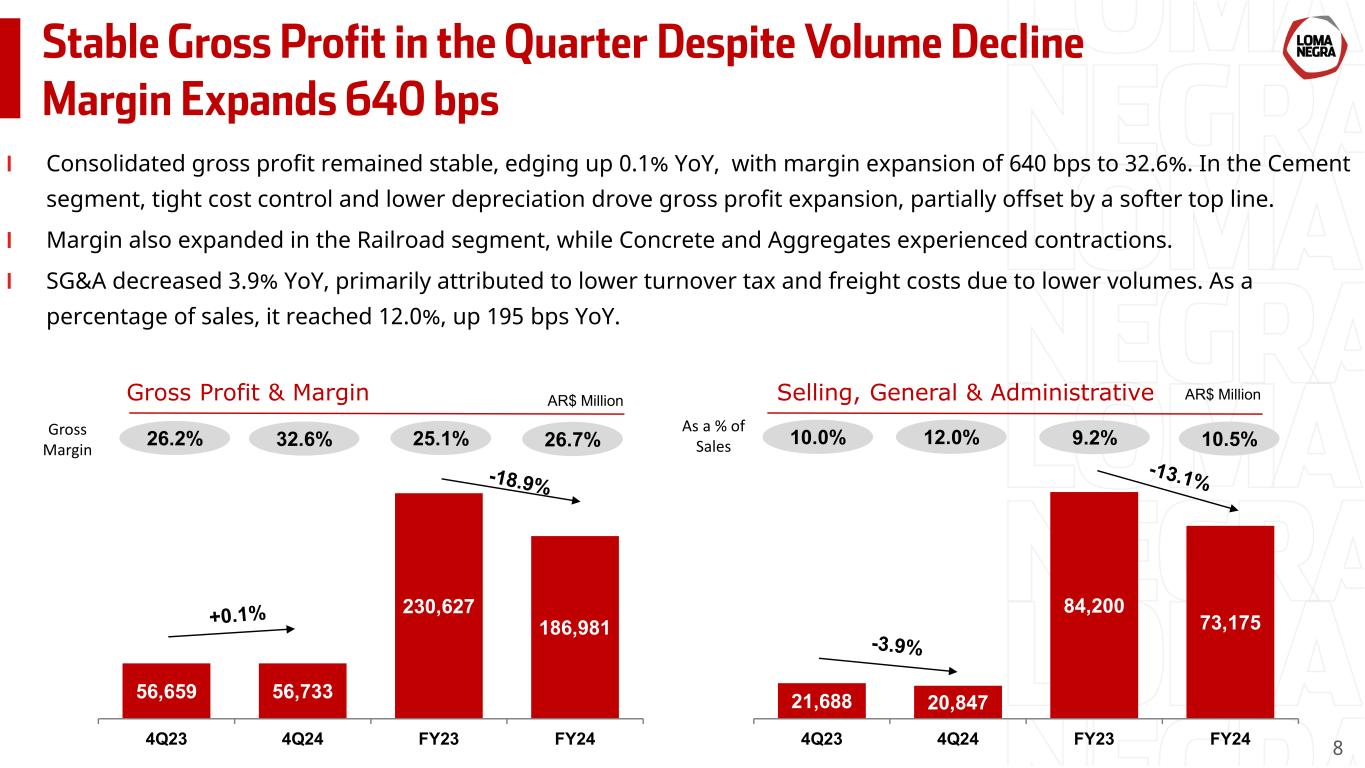 逐步改善:营收收缩继续收窄同比收入表现:水泥、砖石和石灰:同比下降19.9%,销量收缩14.1%加上价格表现疲软混凝土:同比下降26.9%。销量下降14.4%铁路:同比下降3.2%。销量增长3.1%,而价格则受到产品组合和市场状况的影响总量:同比下降34.2%,销量下降3.1%,在充满挑战的竞争情况下,24Q4 4Q23 % CHG。水泥、砖石&石灰MM TN 1.31 1.52-14.1 %混凝土MM m3 0.1 10.12-14.4 %铁路MM TN 1.03 1.00 3.1%骨料MM TN 0.28 0.29-3.1 % 4Q24 4Q23 % CHG。153,542191,657-19.9 % 13,53518,513-26.9 % 16,87117,429-3.2 % 4,1926,371-34.2 %销量(1)收入(百万AR美元)(2)(1)销量包括分部间销售(2)销售收入包括分部间销售和其他分部620242023% CHG。4.906.42-23.7 % 0.40 0.58-31.8 % 3.63 4.20-13.4 % 0.97 1.29-24.8 % 20242023% CHG。619,927805,719-23.1 % 55,64688,165-36.9 % 64,90472,440-10.4 % 17,26928,066-38.5 %总净营收174,173216,452-19.5 % 699,179919,31323.9%