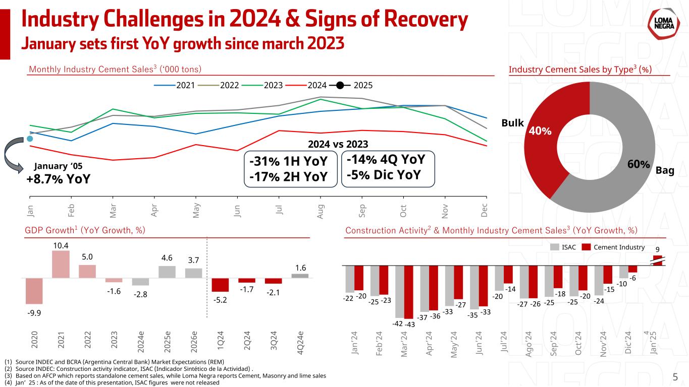 2024年行业挑战&复苏迹象1月创下2023年3月以来首次同比增长-9.9 10.45.0-1.6-2.8 4.6 3.7-5.2-1.7-2.1 1.6 20202021202220232024 e 2025 e 2026 e 1Q 24 2Q 24 Q3 24 4Q 24 e GDP增长1(同比增长,%)AP r fe b Ja n m ar m ay n ovju n au g d ec se p o ct 2025202220212024月度行业水泥销量3(‘000吨)2023-22-25-42-37-33-35-20-27-25-24-10-20-23-43-36-27-33-14-26-18-20-15-6 Ja n’24 fe b‘24 m ar’2 4 ap r‘24 m ay’2 4 ju n‘24 ju l’2 4 AG o‘24 se p’24 oct‘2 4 nov’2 4 dic‘2 4 Ja n’25 9ISAC水泥行业JU L行业水泥销售按类型3(%)建筑活动2 &月度行业水泥销售3(同比增长,%)(1)来源INDEC和BCRA(阿根廷央行)市场预期(REM)(2)来源INDEC:建筑活动指标,ISAC(Indicador Sint é tico de la Actividad)。(3)基于AFCP,其中报告了独立的水泥销售,而Loma Negra报告了水泥、砖石和石灰的销售(4)1月25日:截至本演示文稿发布之日,ISAC数据尚未发布60% 40%袋散装54-31 % 1H YoY-17 % 2H YoY-14 % 4Q YoY-5 % DIC YoY 1月'05 + 8.7% YoY 2024 vs 2023