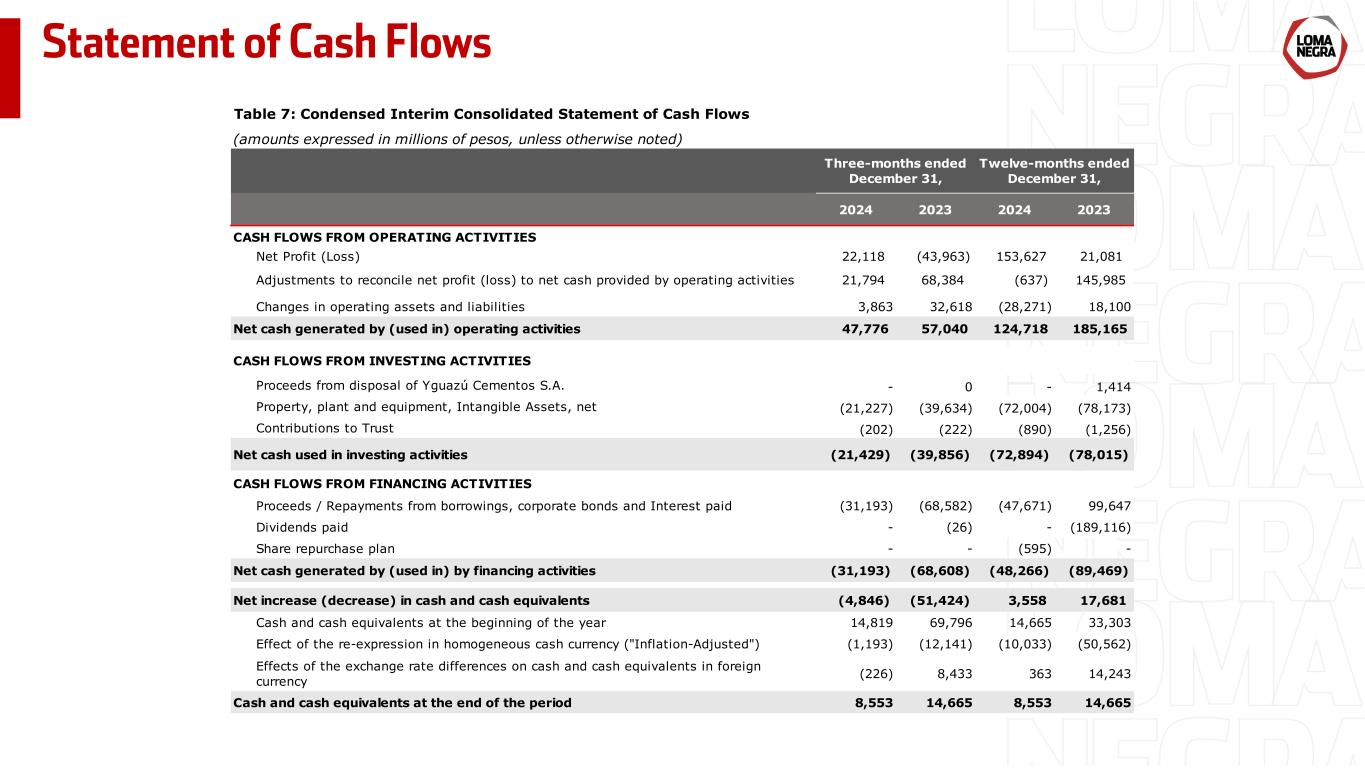 现金流量表表7:简明中期合并现金流量表(金额以百万比索表示,除非另有说明)2024202320242023经营活动产生的现金流量净利润(亏损)22,118(43,963)153,62721,081调整净利润(亏损)与经营活动提供的现金净额21,79468,384(637)145,985经营资产和负债变动3,86332,618(28,271)18,100经营活动产生(用于)的现金流量净额47,77657,040124,718185,165投资活动产生的现金流量处置Yguaz ú Cementos S.A.的收益-0-1,414物业、厂房和设备,净额(21,227)(39,634)(72,004)(78,173)信托出资(202)(222)(890)(1,256)投资活动使用的现金净额(21,429)(39,856)(72,894)(78,015)筹资活动产生的现金流量收益/借款偿还,公司债券及付息(31,193)(68,582)(47,671)99,647支付股利-(26)-(189,116)股份回购计划--(595)-筹资活动产生(用于)的现金净额(31,193)(68,608)(48,266)(89,469)现金及现金等价物净增加(减少)(4,846)(51,424)3,55817,681年初现金及现金等价物14,81969,79614,66533,303以同质现金货币重新表示的影响(“经通胀调整”)(1,193)(12,141)(10,033)(50,562)汇率差异对外币现金及现金等价物的影响(226)8,43336314,243现金期末现金及等价物8,55314,6658,55314,665截至12月31日止十二个月、截至12月31日止三个月、