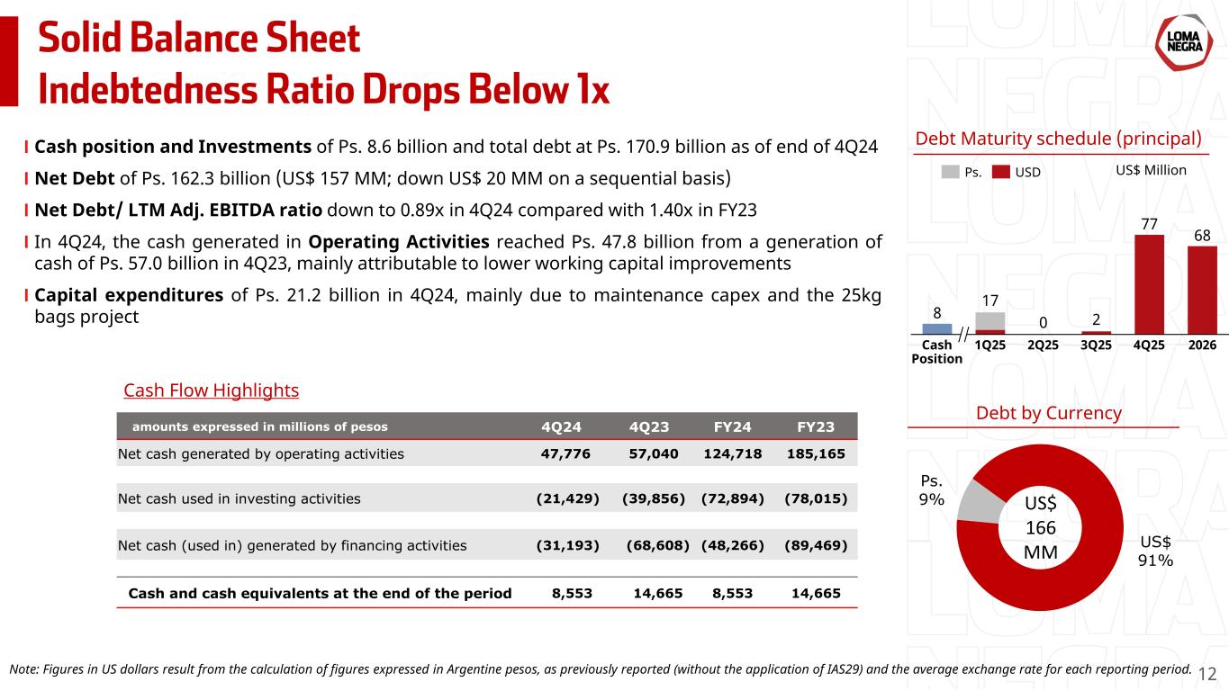 49注:按先前报告的(未适用IAS29)和每个报告期的平均汇率计算,以美元为单位的数字是根据以阿根廷比索表示的数字计算得出的。PS的现金状况和投资。86亿,总债务为PS。截至4Q24末Ps净负债1709亿。1623亿(157mm美元;环比下降20mm)净债务/LTM调整后EBITDA率降至2024年第四季度的0.89x,而2024年第四季度为23财年的1.40x,经营活动产生的现金达到PS。478亿来自一代PS的现金。4Q23为570亿,主要归因于营运资本改善较低的PS资本支出。212亿4Q24,主要由于维护资本支出和25kg袋项目现金流凸显91% PS。9%债务按货币分类债务到期时间表(本金)百万美元87768现金状况1Q25 2Q25 3Q25 4Q25 20260217 PS。美元166毫米12固体资产负债表负债比率降至1倍以下,以百万比索表示4Q24 4Q23 FY24 FY23经营活动产生的现金净额47,77657,040124,718185,165投资活动使用的现金净额(21,429)(39,856)(72,894)(78,015)筹资活动产生的现金净额(用于)(31,193)(68,608)(48,266)(89,469)期末现金及现金等价物8,55314,6658,55314,665