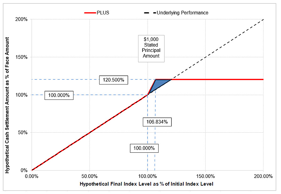 基础指数价值增加,到期时PLUS赎回规定本金1000.00美元加指数百分比涨幅的300.00%,但须在到期时支付每PLUS至少1205.00美元的最高金额(至少为申报本金的120.50%) (定价日)。