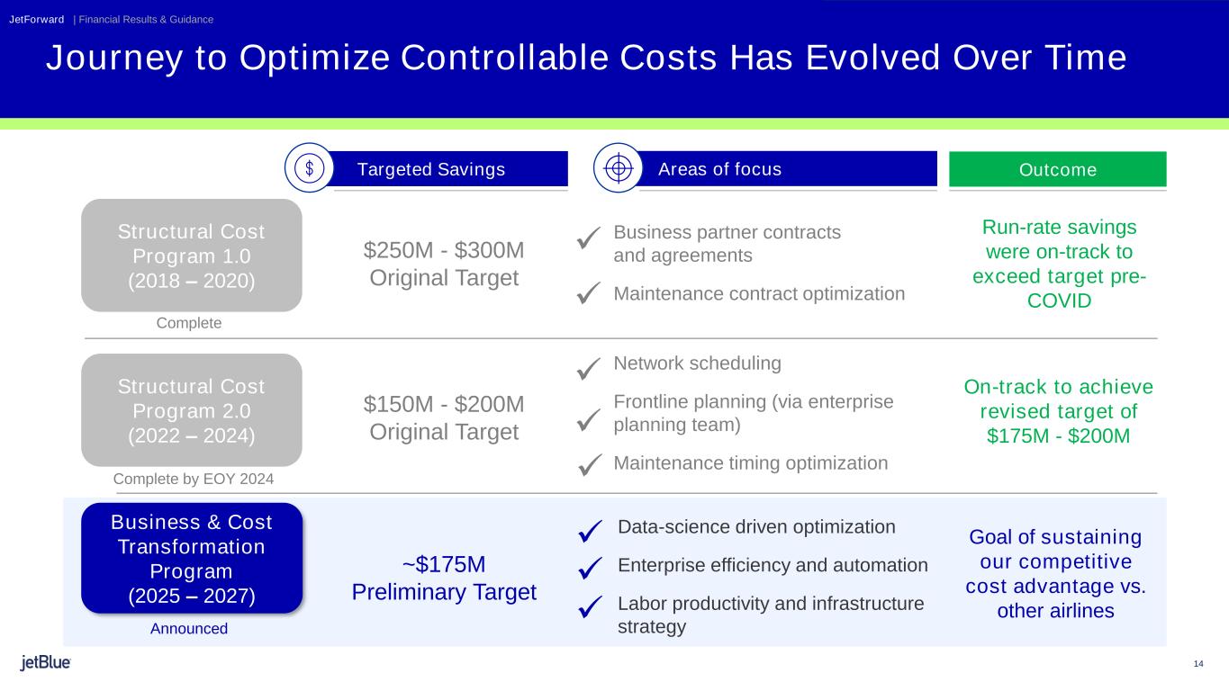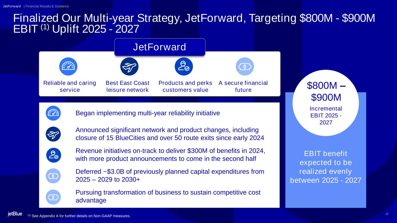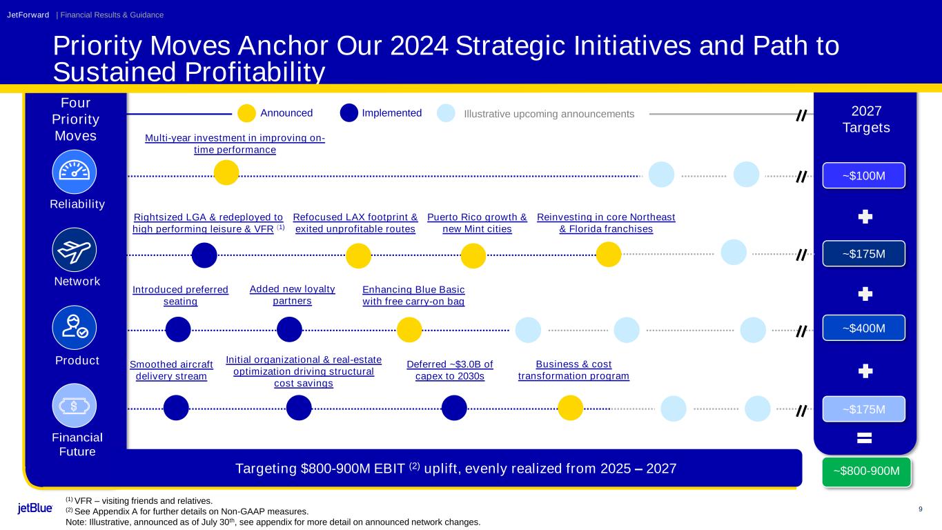 9个优先举措锚定我们的2024年战略举措和持续盈利能力之路产品可靠性金融未来推出优选座位增强Blue Basic与免费随身行李增加新的忠诚度合作伙伴四个优先举措~1.75亿美元~4亿美元~1亿美元2027年目标~800-9000美元平滑飞机交付流多年投资改善准时性能递延约3.0B美元的资本支出至2030年代,目标是800-9000亿美元的息税前利润(2)提升,2025-2027年平均实现初步组织和房地产优化推动结构性成本节约宣布实施JetForward |财务业绩和指导说明性即将发布的公告网络重新聚焦LAX足迹&退出无利可图的路线~1.75亿美元波多黎各增长&新铸币厂城市调整LGA &重新部署到高绩效休闲& VFR(1)再投资于核心东北部和佛罗里达州特许经营业务&成本转型计划(1)VFR –拜访朋友和亲戚。(2)有关非公认会计原则措施的更多详细信息,请参见附录A。注:说明性,截至7月30日公布,有关公布的网络变化的更多详细信息,请参见附录。