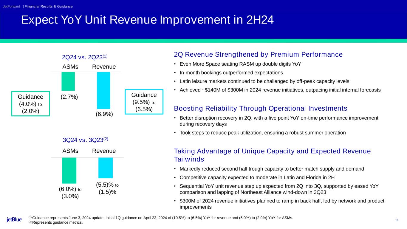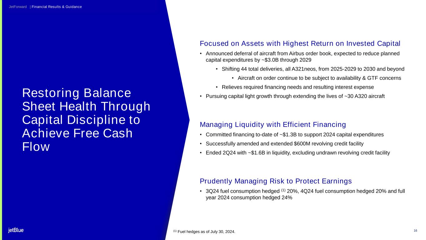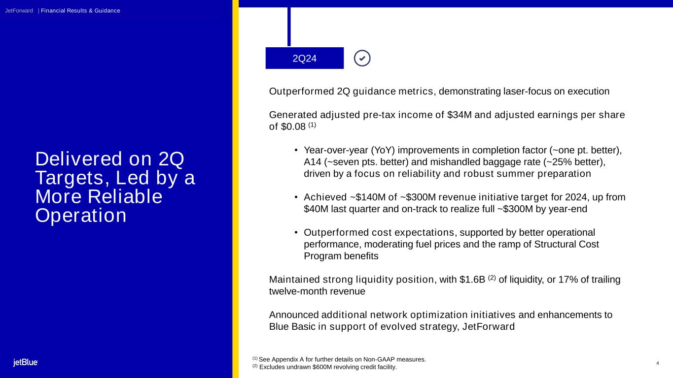 4实现了第二季度的目标,由更可靠的运营引领优于第二季度的指导指标,显示出对执行的激光关注产生了3400万美元的调整后税前收入和0.08美元的调整后每股收益(1)•在对可靠性的关注和稳健的夏季准备的推动下,完成率(约1个百分点)、A14(约7个百分点)和不当处理的行李率(约25%)同比(YoY)改善• 2024年实现了约1.4亿美元的约3亿美元收入倡议目标,高于上季度的4000万美元,并有望在年底前实现全部约3亿美元•在更好的运营业绩的支持下,超出了成本预期,燃料价格放缓和结构性成本计划收益的增加保持了强劲的流动性状况,1.6B美元(2)的流动性,或过去12个月收入的17%宣布了额外的网络优化举措和对Blue Basic的增强,以支持进化战略,JetForward 2Q24 JetForward |财务业绩和指导(1)有关非公认会计原则措施的更多详细信息,请参见附录A。(2)不包括未提取的6亿美元循环信贷额度。