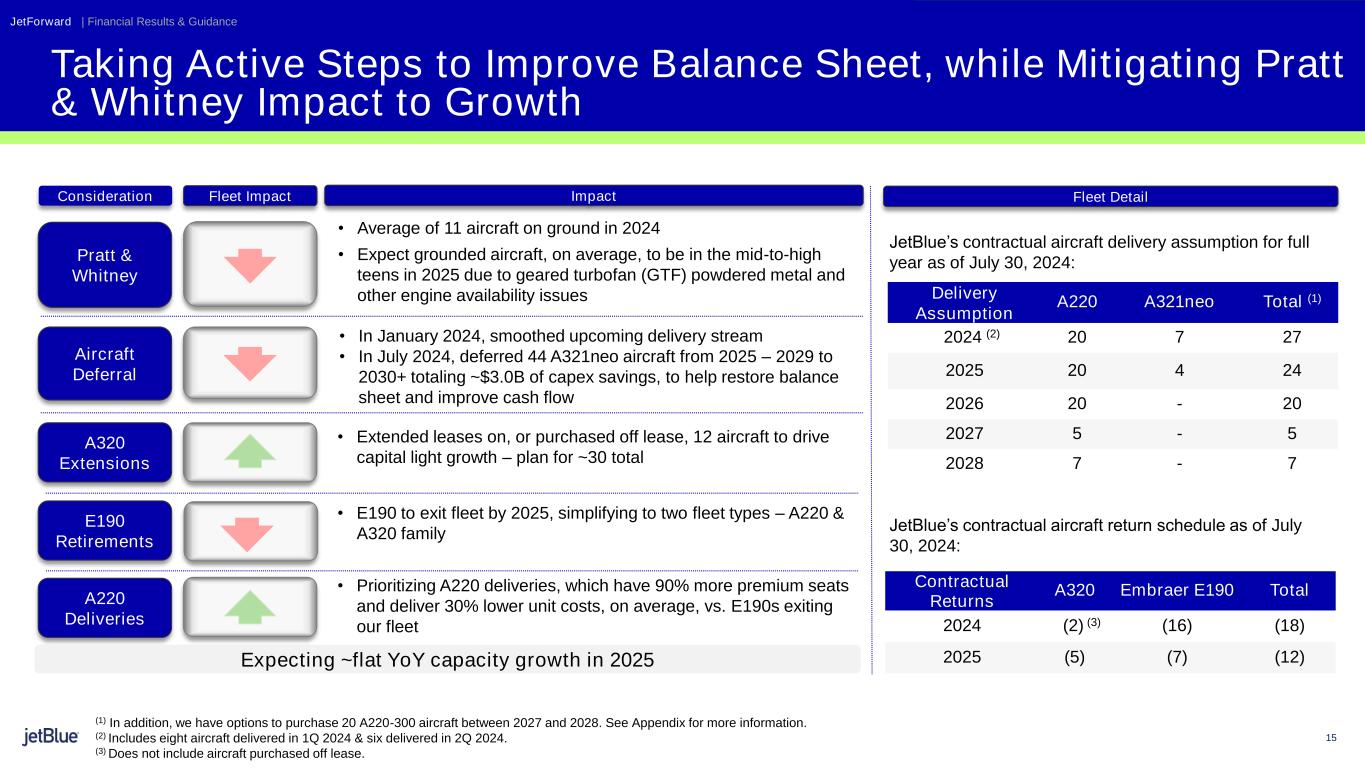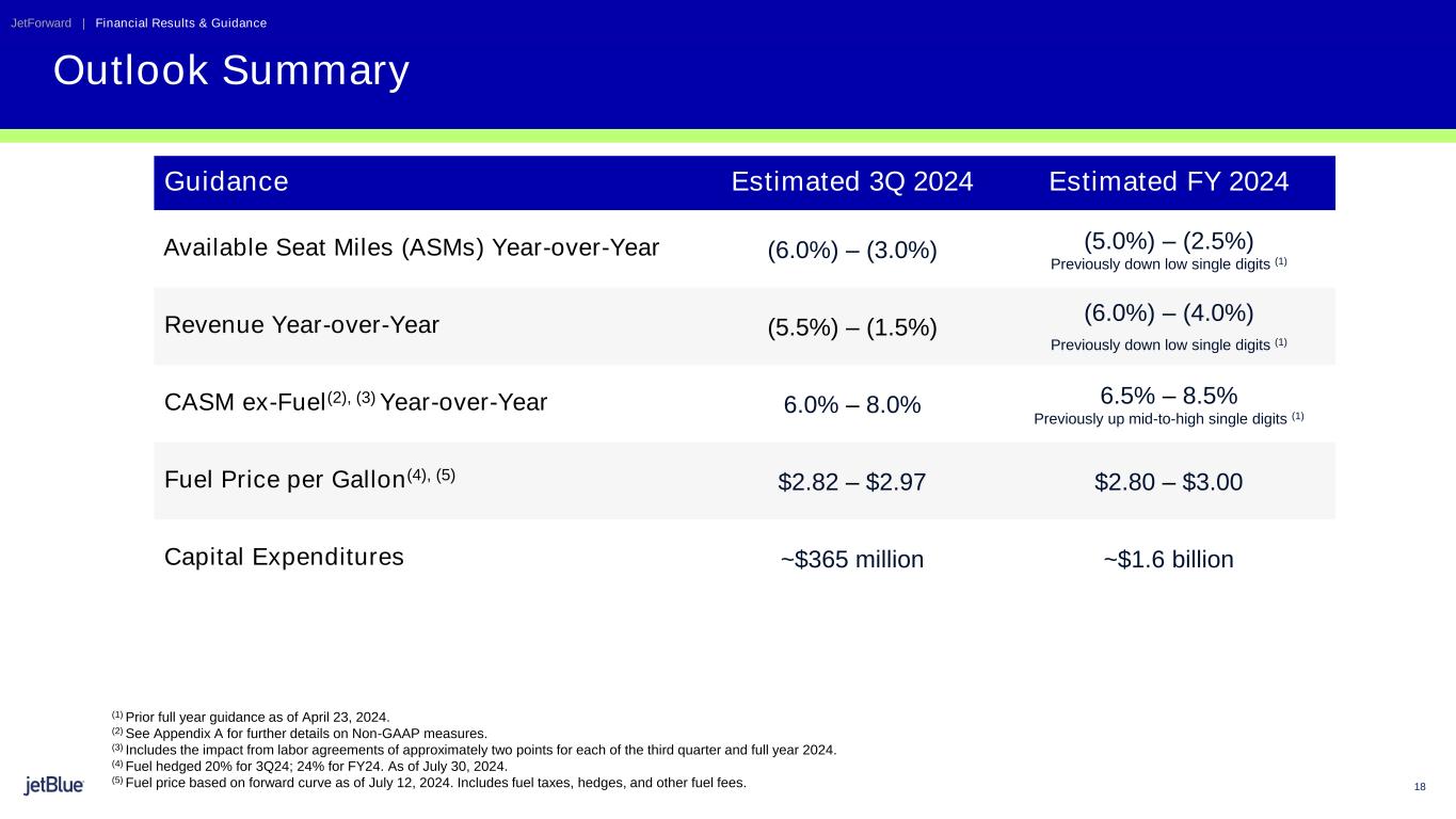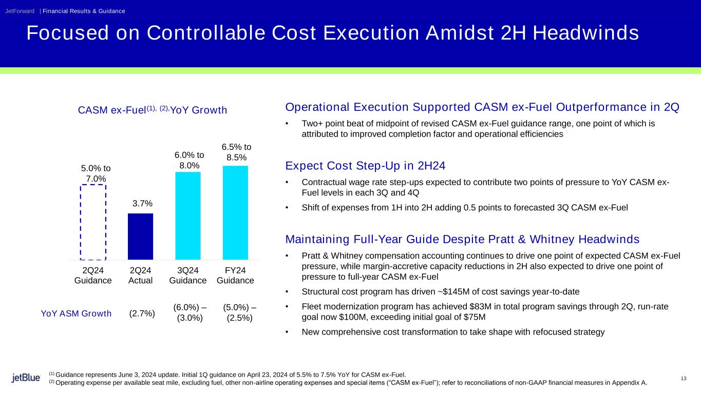 4实现了第二季度的目标,由更可靠的运营引领优于第二季度的指导指标,显示出对执行的激光关注产生了3400万美元的调整后税前收入和0.08美元的调整后每股收益(1)•在对可靠性的关注和稳健的夏季准备的推动下,完成率(约1个百分点)、A14(约7个百分点)和不当处理的行李率(约25%)同比(YoY)改善• 2024年实现了约1.4亿美元的约3亿美元收入倡议目标,高于上季度的4000万美元,并有望在年底前实现全部约3亿美元•在更好的运营业绩的支持下,超出了成本预期,燃料价格放缓和结构性成本计划收益的增加保持了强劲的流动性状况,1.6B美元(2)的流动性,或过去12个月收入的17%宣布了额外的网络优化举措和对Blue Basic的增强,以支持进化战略,JetForward 2Q24 JetForward |财务业绩和指导(1)有关非公认会计原则措施的更多详细信息,请参见附录A。(2)不包括未提取的6亿美元循环信贷额度。