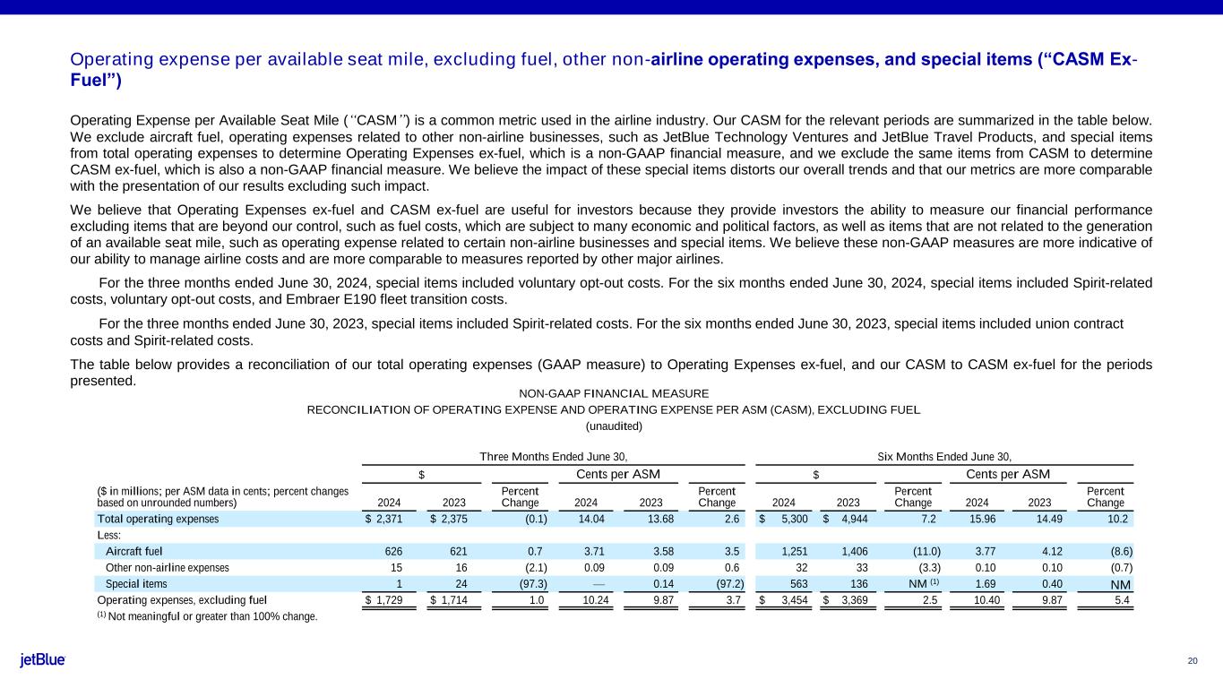 20每可用座位英里的运营费用,不包括燃料、其他非航空公司运营费用和特殊项目(“CASM Ex-Fuel”)每可用座位英里的运营费用(“CASM”)是航空业常用的指标。我们相关期间的CASM汇总于下表。我们从总运营费用中剔除飞机燃料、与其他非航空业务相关的运营费用,例如捷蓝科技风险投资公司和捷蓝旅游产品,以及特殊项目,以确定运营费用除油,这是一种非公认会计准则财务指标,我们从CASM中剔除相同项目以确定CASM除油,这也是一种非公认会计准则财务指标。我们认为,这些特殊项目的影响扭曲了我们的整体趋势,我们的指标与排除此类影响的结果的表述更具可比性。我们认为,除燃料外的运营费用和CASM除燃料外的运营费用对投资者有用,因为它们为投资者提供了衡量我们财务业绩的能力,不包括我们无法控制的项目,例如受许多经济和政治因素影响的燃料成本,以及与可用座公里数的生成无关的项目,例如与某些非航空公司业务和特殊项目相关的运营费用。我们认为,这些非公认会计准则衡量标准更能表明我们管理航空公司成本的能力,并且与其他主要航空公司报告的衡量标准更具可比性。截至2024年6月30日的三个月,特殊项目包括自愿退出成本。截至2024年6月30日的六个月,特殊项目包括精神相关成本、自愿选择退出成本以及巴西航空工业公司E190机队过渡成本。截至2023年6月30日止三个月,特别项目包括精神相关成本。截至2023年6月30日止六个月,特殊项目包括工会合同成本和精神相关成本。下表提供了我们的总运营费用(GAAP衡量标准)与除燃料的运营费用以及我们的CASM与除燃料的CASM在所述期间的对账。非公认会计准则财务计量每ASM(CASM)的营业费用和营业费用的对账,不包括燃料(未经审计)截至6月30日止三个月、截至6月30日止六个月,$ cents每ASM $ cents每ASM(百万美元;每ASM数据以美分为单位;百分比变化基于未四舍五入的数字)20242023百分比变化20242023百分比变化20242023百分比变化20242023百分比变化总运营费用$ 2,371 $ 2,375(0.1)14.04 13.68 2.6 $ 5,300 $ 4,9447.2 15.96 14.49 10.2减:飞机燃油62662 10.7 3.71 3.58 3.51,2511,406(11.0)3.77 4.12(8.6)其他非航空公司费用1516(2.1)0.09 0.09 0.63 233(3.3)0.10 0.10(0.7)特殊项目124(97.3)— 0.14(97.2)563136 NM(1)1.690.40 NM运营费用,不包括燃料$ 1,729 $ 1,7141.0 10.24 9.87 3.7 $ 3,454 $ 3,369 2.5 10.409.87 5.4(1)无意义或大于100%的变化。