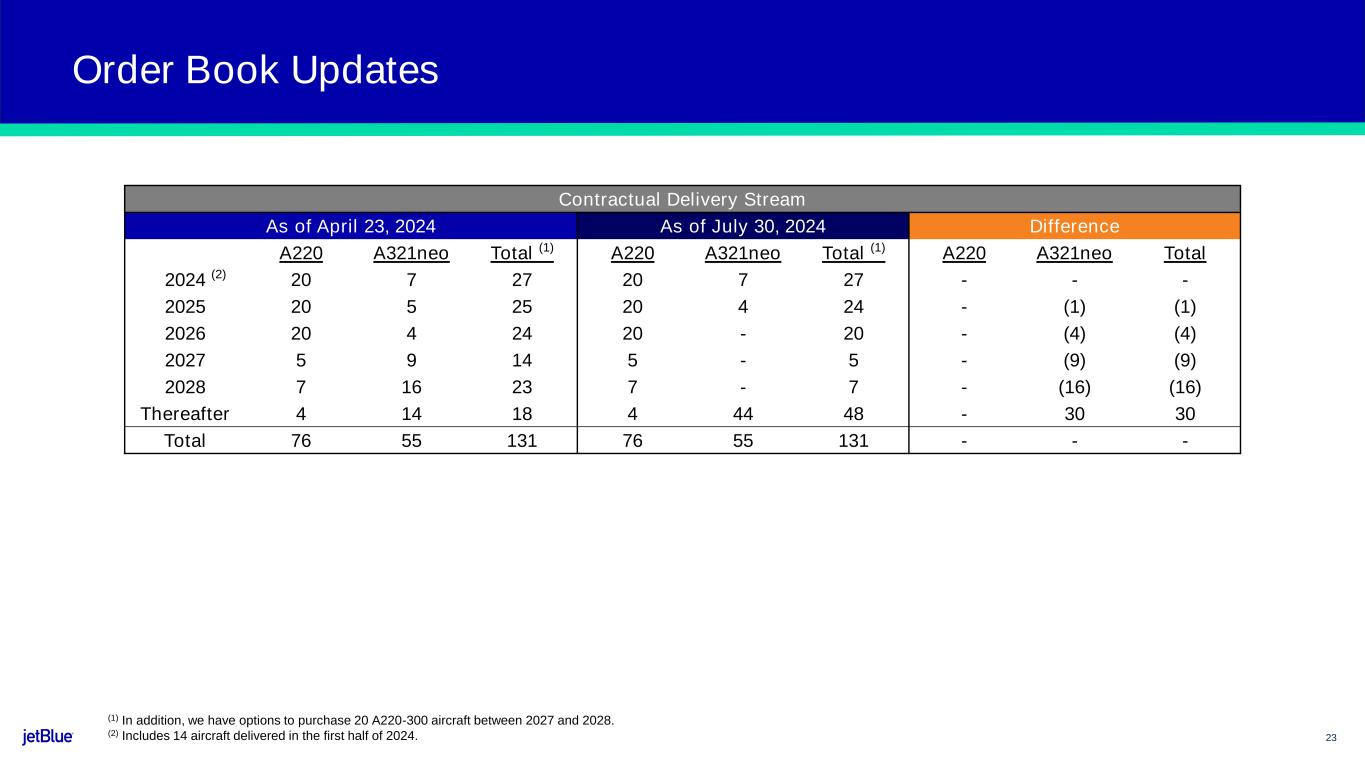 23日订单簿更新截至2024年4月23日的合同交付流截至7月30日,2024差额A220 A321neo合计(1)A220 A321neo合计(1)A220 A321neo合计2024(2)2072720727---2025年2052520424-(1)(1)20262042420-20-(4)(4)202759145-5-(9)(9)2028716237-7-(16)(16)此后4141844448-3030合计76551317655131---(1)此外,我们可以选择在2027年至2028年期间购买20架A220-300飞机。(2)包括2024年上半年交付的14架飞机。