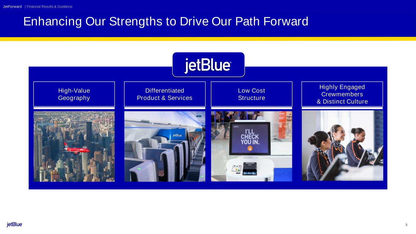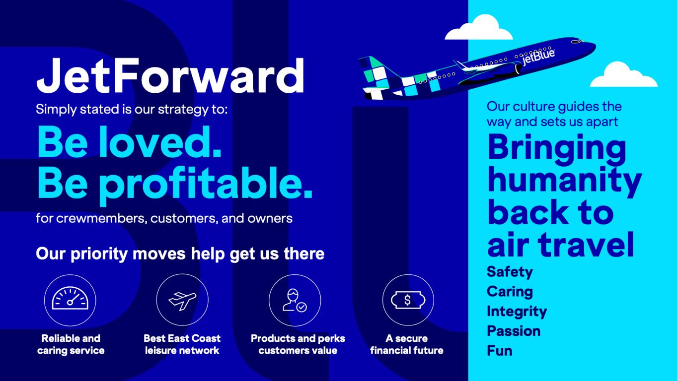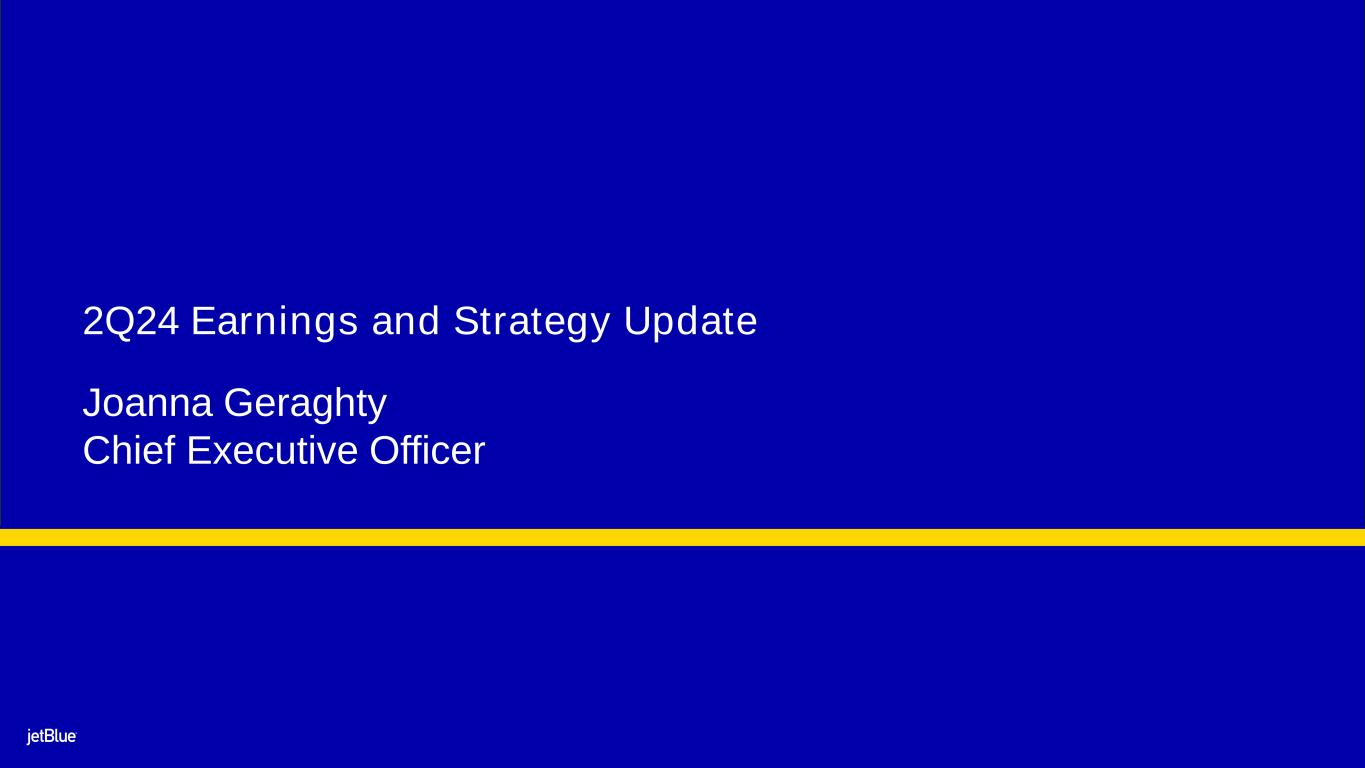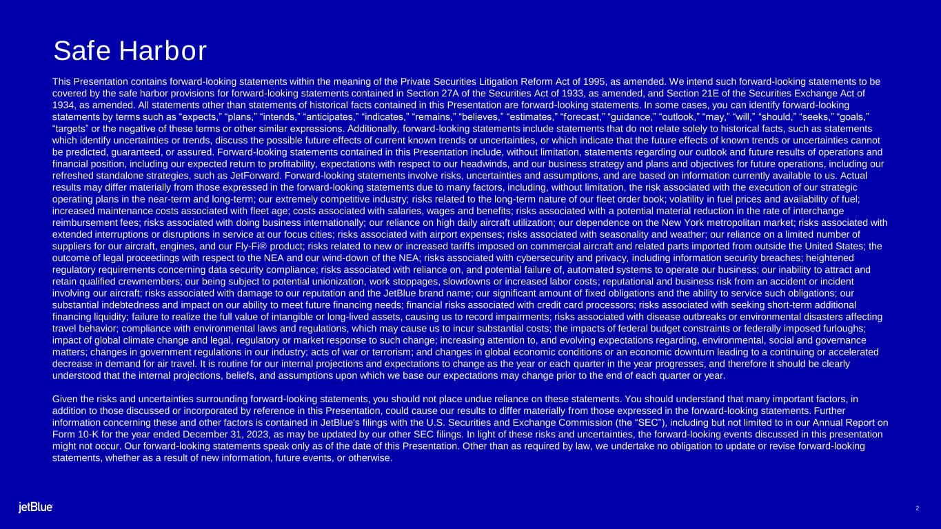 2安全港本演示文稿包含经修订的1995年《私人证券诉讼改革法案》含义内的前瞻性陈述。我们打算将这些前瞻性陈述纳入经修订的1933年《证券法》第27A条和经修订的1934年《证券交易法》第21E条所载前瞻性陈述的安全港条款。本演示文稿中包含的历史事实陈述以外的所有陈述均为前瞻性陈述。在某些情况下,您可以通过“预期”、“计划”、“打算”、“预期”、“表示”、“仍然”、“相信”、“估计”、“预测”、“指导”、“展望”、“可能”、“将”、“应该”、“寻求”、“目标”、“目标”或这些术语的否定或其他类似表达方式来识别前瞻性陈述。此外,前瞻性陈述包括不完全与历史事实相关的陈述,例如识别不确定性或趋势、讨论当前已知趋势或不确定性可能产生的未来影响或表明无法预测、保证或保证已知趋势或不确定性的未来影响的陈述。本演示文稿中包含的前瞻性陈述包括但不限于关于我们的前景和未来经营业绩和财务状况的陈述,包括我们预期的盈利回报、对我们逆风的预期,以及我们的业务战略以及未来经营的计划和目标,包括我们更新的独立战略,例如JetForward。前瞻性陈述涉及风险、不确定性和假设,并基于我们目前可获得的信息。由于许多因素,实际结果可能与前瞻性陈述中表达的结果存在重大差异,包括但不限于与执行我们的近期和长期战略运营计划相关的风险;我们极具竞争力的行业;与我们车队订单的长期性相关的风险;燃料价格和燃料供应的波动;与车队年龄相关的维护成本增加;与工资相关的成本,工资和福利;与交换报销费率可能大幅降低相关的风险;与国际业务相关的风险;我们对飞机日利用率高的依赖;我们对纽约大都市市场的依赖;与我们重点城市的服务长期中断或中断相关的风险;与机场费用相关的风险;与季节性和天气相关的风险;我们对飞机、发动机、以及我们的Fly-Fi ®产品;与对从美国境外进口的商用飞机及相关零部件征收新的或增加的关税相关的风险;与NEA有关的法律诉讼结果和我们对NEA的逐渐结束;与网络安全和隐私相关的风险,包括信息安全漏洞;有关数据安全合规性的监管要求提高;与依赖自动化系统运营我们的业务相关的风险以及潜在的故障;我们无法吸引和留住合格的机组成员;我们受到潜在的工会、停工、劳动力成本放缓或增加;涉及我们飞机的事故或事件带来的声誉和业务风险;与我们的声誉和捷蓝航空品牌名称受损相关的风险;我们大量的固定债务和履行此类义务的能力;我们的巨额债务以及对我们满足未来融资需求的能力的影响;与信用卡处理商相关的财务风险;与寻求短期额外融资流动性相关的风险;未能实现无形资产或长期资产的全部价值,导致我们记录损害;与影响旅行行为的疾病爆发或环境灾难相关的风险;遵守环境法律法规,这可能导致我们产生大量成本;联邦预算限制或联邦强制休假的影响;全球气候变化的影响以及对这种变化的法律、监管或市场反应;对环境的日益关注和不断变化的预期,社会和治理事务;我们行业的政府法规变化;战争或恐怖主义行为;以及全球经济状况变化或经济衰退导致航空旅行需求持续或加速减少。我们内部的预测和预期随着一年或一年中的每个季度的进展而发生变化是例行的,因此应该清楚地了解,内部的预测、信念、 以及我们基于预期的假设可能会在每个季度或年度结束前发生变化。鉴于围绕前瞻性陈述的风险和不确定性,您不应过分依赖这些陈述。您应该了解,除了本演示文稿中讨论或通过引用纳入的因素外,许多重要因素可能会导致我们的结果与前瞻性陈述中表达的结果存在重大差异。有关这些因素和其他因素的更多信息包含在捷蓝航空提交给美国证券交易委员会(“SEC”)的文件中,包括但不限于我们截至2023年12月31日止年度的10-K表格年度报告中,我们的其他SEC文件可能会更新这些信息。鉴于这些风险和不确定性,本演示文稿中讨论的前瞻性事件可能不会发生。我们的前瞻性陈述仅在本演示文稿发布之日发表。除法律要求外,我们不承担更新或修改前瞻性陈述的义务,无论是由于新信息、未来事件或其他原因。2