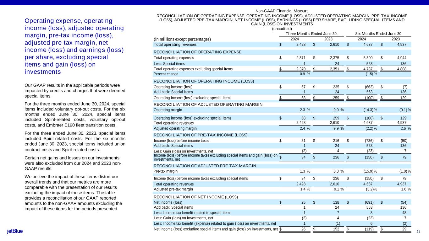 21营业费用、营业收入(亏损)、调整后营业利润率、税前收入(亏损)、调整后税前利润率、每股净收益(亏损)和收益(亏损),不包括特殊项目和投资收益(亏损)我们在适用期间的公认会计原则结果受到被视为特殊项目的贷项和费用的影响。截至2024年6月30日的三个月,特殊项目包括自愿退出成本。截至2024年6月30日止六个月,特殊项目包括精神相关成本、自愿选择退出成本以及巴西航空工业公司E190机队过渡成本。截至2023年6月30日止三个年度,特别项目包括精神相关成本。截至2023年6月30日止六个月,特殊项目包括工会合同成本和精神相关成本。我们的投资的某些净损益也被排除在我们2024年和2023年的非公认会计原则业绩之外。我们认为,这些项目的影响扭曲了我们的整体趋势,我们的指标与排除这些项目影响的结果的表述更具可比性。该表提供了我们的GAAP报告金额与非GAAP金额的对账,其中不包括这些项目对所述期间的影响。非公认会计准则财务计量调节营业费用、营业收入(亏损)、调整后营业利润率、税前收入(亏损)、调整后税前利润率、净收入(亏损)、每股收益(亏损),不包括特殊项目和投资收益(亏损)(未经审计)截至6月30日止三个月、截至6月30日止六个月,(百万除百分比外)2024202320242023营业总收入$ 2,428 $ 2,610 $ 4,637 $ 4,937营业费用调节总营业费用$ 2,371 $ 2,375 $ 5,300 $ 4,944减:特殊项目124563136营业费用总额不包括特殊项目$ 2,370 $ 2,351 $ 4,737 $ 4,808%变动0.9%(1.5)%营业收入调节(亏损)营业收入(亏损)$ 57 $ 235 $(663)$(7)加回:特殊项目124563136营业收入(亏损)不包括特殊项目$ 58 $ 259 $(100)$ 129调整后调节营业利润率营业利润率2.3% 9.0%(14.3)%(0.1)%不包括特殊项目的营业收入(亏损)$ 58 $ 259 $(100)$ 129营业总收入2,4282,6104,6374,937调整后营业利润率2.4% 9.9%(2.2)% 2.6%所得税前税前收入(亏损)收入(亏损)调节$ 31 $ 216 $(736)$(50)加回:特殊项目124563136减:投资收益(亏损),净额(2)4(23)7除特殊项目和投资收益(亏损)的所得税前收入(亏损),净额$ 34 $ 236 $(150)$ 79调整后税前利润率调节税前利润率1.3% 8.3%(15.9)%(1.0)%不包括特殊项目的所得税前收入(亏损)$ 34 $ 236 $(150)$ 79营业总收入2,4282,6104,6374,937调整后税前利润率1.4% 9.1%(3.2)% 1.6%净收入(亏损)调节净收入(亏损)$ 25 $ 138 $(691)$(54)加回:特殊项目124563136减:与特殊项目相关的所得税优惠17848减:投资收益(亏损),净额(2)4(23)7减:与投资收益(损失)相关的所得税收益(费用),净额1(1)6(2)不计特殊项目和投资收益(损失)的净收入(损失),净额$ 26 $ 152 $(119)$ 29