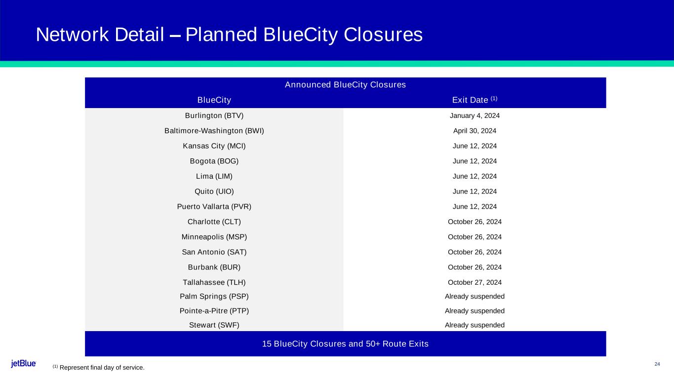 24网络详情–计划中的蓝城兄弟关闭时间公布蓝城兄弟关闭蓝城兄弟退出日期(1)伯灵顿(BTV)2024年1月4日巴尔的摩-华盛顿(BWI)2024年4月30日堪萨斯城(MCI)2024年6月12日波哥大(BOG)2024年6月12日利马(LIM)2024年6月12日基多(UIO)2024年6月12日巴亚尔塔港(PVR)2024年6月12日夏洛特(CLT)2024年10月26日明尼阿波利斯(MSP)2024年10月26日圣安东尼奥(SAT)2024年10月26日伯班克(BUR)2024年10月26日塔拉哈西(TLH)10月27日,2024 Palm Springs(PSP)已经暂停Pointe-a-Pitre(PTP)已经暂停Stewart(SWF)已经暂停15个蓝城兄弟关闭和50 +个路线出口(1)代表服务的最后一天。