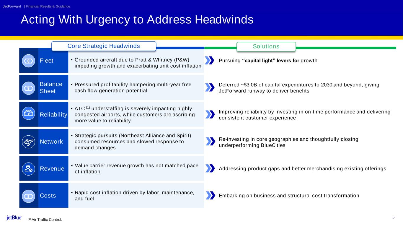 7开始业务和结构成本转型•劳动力、维护和燃料成本推动的成本快速上涨解决产品差距和更好地销售现有产品•价值载体收入增长与通胀步伐不匹配收入重新投资于核心地区并深思熟虑地关闭表现不佳的蓝色城市•战略追求(东北联盟和精神)消耗了资源并减缓了对需求变化的响应网络通过投资准时性能和提供一致的客户体验来提高可靠性• ATC(1)人员不足正在严重影响高度拥堵的机场,当客户将更多价值归于可靠性可靠性时,追求“轻资本”杠杆促进增长•由于普惠(P & W)阻碍增长并加剧单位成本通胀,停飞的飞机机队将约3.0B美元的资本支出推迟到2030年及以后,为JetForward跑道提供了效益•盈利能力承压阻碍了多年自由现金流产生的潜在资产负债表解决方案JetForward |财务业绩与指导(1)空中交通管制。核心战略逆风紧急采取行动应对逆风