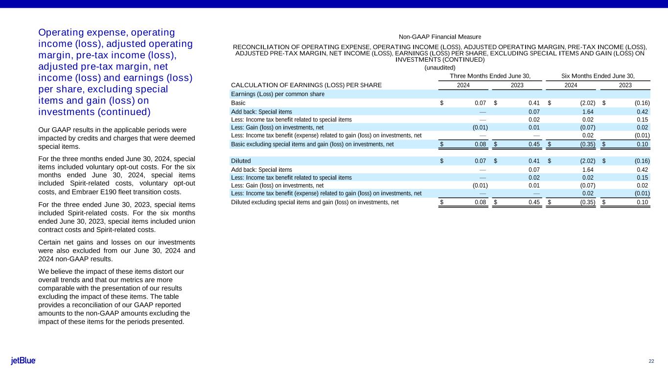 22营业费用、营业收入(亏损)、调整后营业利润率、税前收入(亏损)、调整后税前利润率、每股净收益(亏损)和收益(亏损),不包括特殊项目和投资收益(亏损)(续)我们在适用期间的GAAP业绩受到被视为特殊项目的贷项和费用的影响。截至2024年6月30日的三个月,特殊项目包括自愿退出成本。截至2024年6月30日止六个月,特殊项目包括精神相关成本、自愿选择退出成本以及巴西航空工业公司E190机队过渡成本。截至2023年6月30日止三个年度,特别项目包括精神相关成本。截至2023年6月30日止六个月,特殊项目包括工会合同成本和精神相关成本。我们投资的某些净损益也被排除在我们2024年6月30日和2024年非公认会计准则业绩之外。我们认为,这些项目的影响扭曲了我们的整体趋势,我们的指标与排除这些项目影响的结果的表述更具可比性。该表提供了我们的GAAP报告金额与非GAAP金额的对账,其中不包括这些项目对所述期间的影响。非公认会计准则财务计量调节营业费用、营业收入(亏损)、调整后营业利润率、税前收入(亏损)、调整后税前利润率、净收入(亏损)、每股收益(亏损),不包括特殊项目和投资收益(亏损)(续)(未经审计)截至6月30日止三个月、截至6月30日止六个月、计算每股收益(亏损)20242023202420232023202320232023202320232023202320232023202320232023202320232023202320232023202320232023202320232023202320232023202320232023202320232023202320232023202320232023202320232023202320232023202320232023202320232023净额(0.01)0.01(0.07)0.02减:与投资收益(损失)相关的所得税收益(费用),净额—— 0.02(0.01)基本不包括特殊项目和投资收益(损失),净额0.08美元0.45美元(0.35)美元0.10稀释后0.07美元0.41美元(2.02)美元(0.16)加回:特殊项目— 0.07 1.64 0.42减:与特殊项目相关的所得税收益— 0.02 0.02 0.15减:投资收益(损失),净额(0.01)0.01(0.07)0.02减:与投资收益(损失)相关的所得税收益(费用),净额—— 0.02(0.01)稀释后不计特殊项目和投资收益(亏损)净额0.08美元0.45美元(0.35)0.10美元