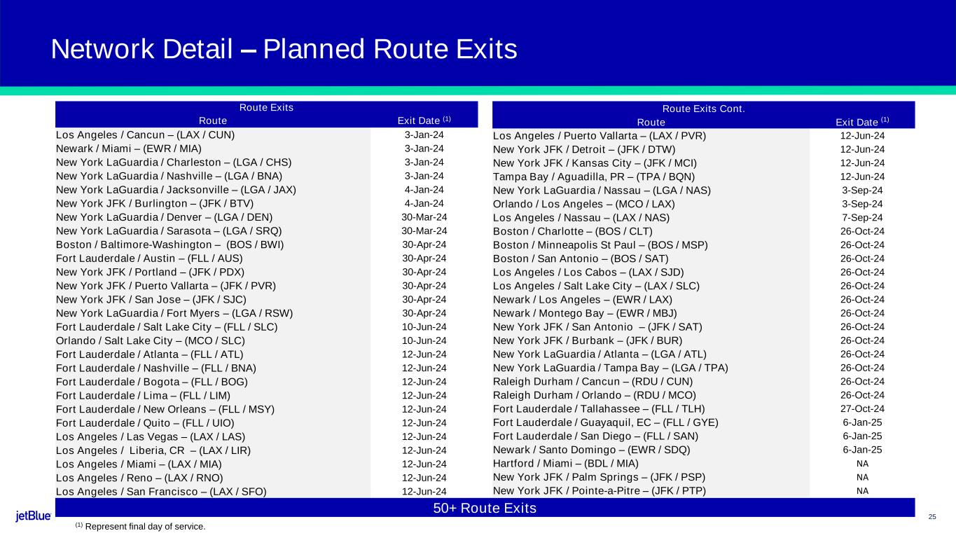 25网络详情–计划路线出口50 +路线出口路线出口路线出口日期(1)洛杉矶/坎昆–(LAX/CUN)3-JA-24纽瓦克/迈阿密–(EWR/MIA)3-JA-24纽约拉瓜迪亚/查尔斯顿–(LGA/CHS)3-JA-24纽约拉瓜迪亚/纳什维尔–(LGA/BNA)3-JA-24纽约拉瓜迪亚/杰克逊维尔–(LGA/JAX)4-JA-24纽约肯尼迪/伯灵顿–(JFK/BTV)4-JA-24纽约拉瓜迪亚/丹佛–(LGA/丨)30-Mar-24纽约拉瓜迪亚/萨拉索塔–(LGA/SRQ)30-Mar-2430-Apr-24劳德代尔堡/奥斯汀–(FLL/AUS)30-Apr-24纽约肯尼迪/波特兰–(JFK/PDX)30-Apr-24纽约肯尼迪/巴亚尔塔港–(JFK/PVR)30-Apr-24纽约肯尼迪/圣何塞–(JFK/SJC)30-Apr-24纽约拉瓜迪亚/迈尔堡–(LGA/RSW)30-Apr-24劳德代尔堡/盐湖城–(LGA/RSW)30-Apr-24劳德代尔堡/盐湖城–(LGA/SLC)10-Jun-24奥兰多/盐湖城–(↓ MCO MCO/SLC)10-Jun-24劳德代尔堡/亚特兰大–(JFLL FLL/ATL)12-Jun-24劳德代尔堡BOG)12-Jun-24劳德代尔堡/利马–(FLL/LIM)12-Jun-24劳德代尔堡/新奥尔良–(FLL/MSY)12-Jun-24劳德代尔堡/基多–(FLL/UIO)12-Jun-24洛杉矶/拉斯维加斯–(LAX/LAS)12-Jun-24洛杉矶/利比里亚、CR –(LAX/LIR)12-Jun-24洛杉矶/迈阿密–(LAX/MIA)12-Jun-24洛杉矶/里诺–(LAX/RNO)12-Jun-24洛杉矶/旧金山–(LAX/SFO)12-Jun-24航线出口续。路线出口日期(1)洛杉矶/巴亚尔塔港–(LAX/PVR)12-Jun-24纽约JFK/底特律–(JFK/DTW)12-Jun-24纽约JFK/堪萨斯城–(JFK/MCI)12-Jun-24坦帕湾/阿瓜迪拉,PR –(TPA/BQN)12-Jun-24纽约拉瓜迪亚/拿骚–(LGA/NAS)3-Sep-24奥兰多/洛杉矶–(MCO/LAX)3-Sep-24洛杉矶/拿骚–(LAX/NAS)7-Sep-24波士顿/夏洛特–(BOS/CLT)26-Oct-24波士顿/明尼阿波利斯圣保罗–(BOS/MSP)26-Oct-24波士顿/圣安东尼奥–(BOS/SAT)26-Oct-24洛杉矶/洛斯卡沃斯–(LAX/SJD)26-Oct-24洛杉矶/盐湖城–(LAX/SLC)26-Oct-24纽瓦克/洛杉矶–(EWR/LAX)26-Oct-24纽瓦克纽约JFK/San Antonio –(JFK/SAT)26-Oct-24纽约JFK/Burbank –(JFK/BUR)26-Oct-24纽约拉瓜迪亚/亚特兰大–(LGA/ATL)26-Oct-24纽约拉瓜迪亚/坦帕湾–(LGA/TPA)26-Oct-24罗利·达勒姆/坎昆–(RDU/CUN)26-Oct-24罗利·达勒姆/奥兰多–(RDU/MCO)26-Oct-24劳德代尔堡/塔拉哈西–(丨FL丨/TLH)27-Oct-24劳德代尔堡/瓜亚基尔,欧共体–(FLL/GYE)25日1月6日劳德代尔堡/圣迭戈–(FLL/SAN)25日1月6日纽瓦克/圣多明各–(EWR/SDQ)25日1月6日哈特福德/迈阿密–(BDL/MIA)NA纽约肯尼迪/棕榈泉–(JFK/PSP)NA纽约肯尼迪/Pointe-a-Pitre –(JFK/PTP)NA(1)代表最后一天的服务。