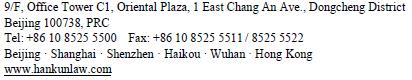 | 1. | 新并购规则.根据我们对PRC法律明文规定的理解,除在注册声明(包括与《试行办法》和《指导意见》及《通知》有关的声明)中披露的情况外,假设在PRC境内没有直接或间接进行过普通股或美国存托凭证的发售、发行或出售,本次发行不需要事先获得中国证监会的批准。然而,《新并购规则》、PRC其他法律和未来PRC法律法规的解释和适用存在很大的不确定性,并且不能保证任何政府机构不会采取与我们在此陈述的意见相反或不同的观点。 |
