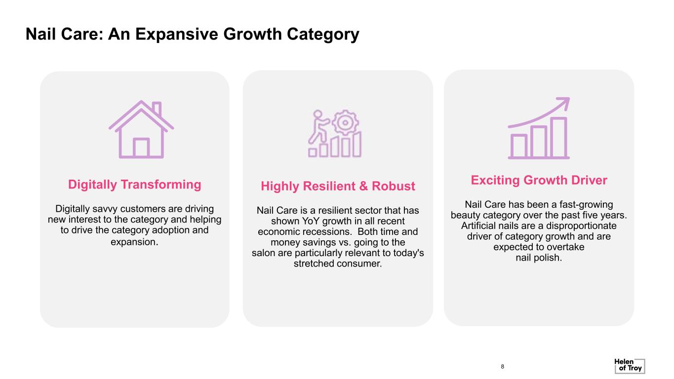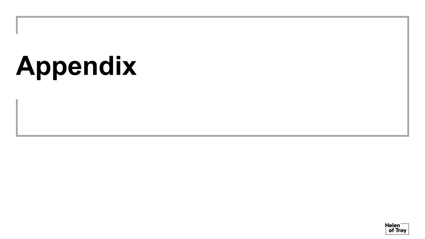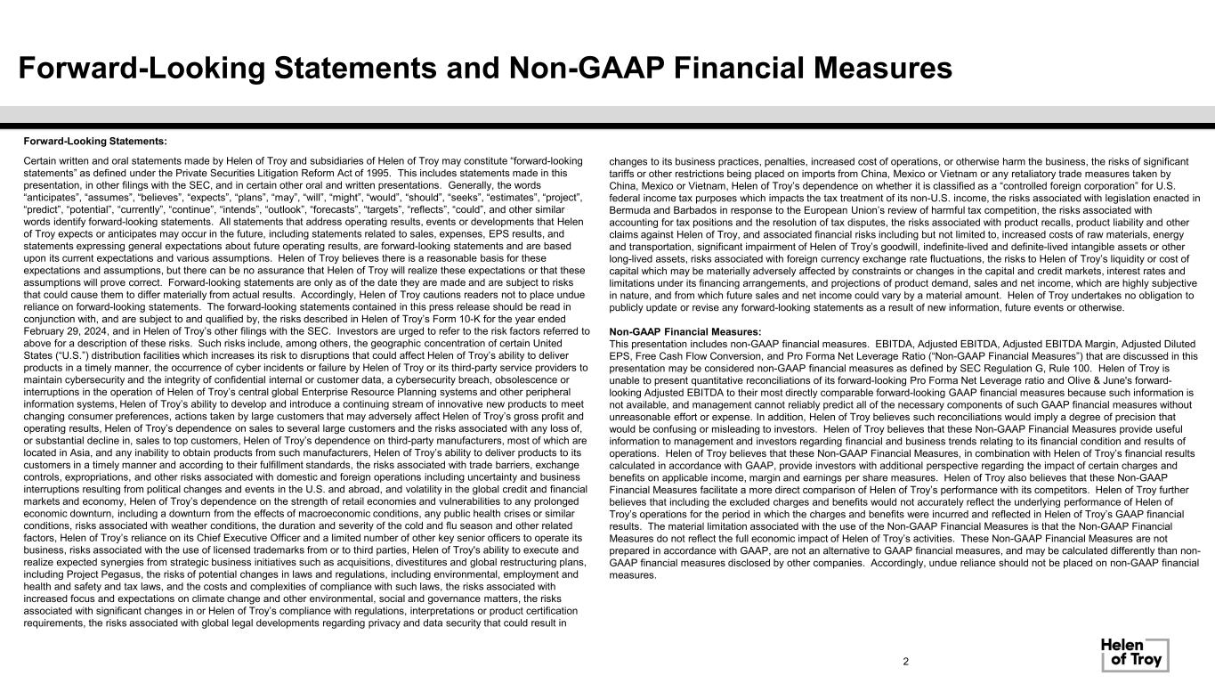 其商业惯例的改变、处罚、运营成本增加或以其他方式损害业务,对来自中国、墨西哥或越南的进口产品征收重大关税或其他限制的风险或中国、墨西哥或越南采取的任何报复性贸易措施,海伦特洛伊家电对其是否因美国联邦所得税目的被归类为“受控外国公司”从而影响其非美国收入的税务处理的依赖,百慕大和巴巴多斯为响应欧盟对有害税收竞争的审查而颁布的立法相关的风险,与税务头寸会计处理和税务纠纷解决相关的风险,与产品召回、针对海伦特洛伊家电的产品责任和其他索赔相关的风险,以及与此相关的财务风险,包括但不限于原材料、能源和运输成本增加,海伦特洛伊家电的商誉、无限期和无限期无形资产或其他长期资产发生重大减值,与外币汇率波动相关的风险,对海伦特洛伊家电的流动性或资金成本可能受到资本和信贷市场约束或变化的重大不利影响的风险,其融资安排下的利率和限制,以及对产品需求、销售和净收入的预测,这在性质上是高度主观的,未来的销售和净收入可能会因此而产生重大差异。海伦特洛伊家电不承担因新信息、未来事件或其他原因而公开更新或修改任何前瞻性陈述的义务。非GAAP财务指标:本演示文稿包括非GAAP财务指标。本演示文稿中讨论的EBITDA、调整后EBITDA、调整后EBITDA利润率、调整后稀释每股收益、自由现金流转换和备考净杠杆率(“非GAAP财务指标”)可被视为SEC条例G、规则100定义的非GAAP财务指标。特洛伊的海伦特洛伊家电无法将其前瞻性备考净杠杆率和Olive & June的前瞻性调整后EBITDA与其最直接可比的前瞻性GAAP财务指标进行量化对账,因为无法获得此类信息,而且管理层无法在没有不合理努力或费用的情况下可靠地预测此类GAAP财务指标的所有必要组成部分。此外,Troy的海伦特洛伊家电认为,这种对账将意味着一定程度的精确度,这会对投资者造成混淆或误导。海伦特洛伊家电的TERM0认为,这些非公认会计准则财务指标为管理层和投资者提供了与其财务状况和经营业绩相关的财务和业务趋势的有用信息。海伦特洛伊家电认为,这些非GAAP财务指标,结合海伦特洛伊家电根据GAAP计算的财务业绩,为投资者提供了额外的视角,了解某些费用和福利对适用的收入、利润率和每股收益指标的影响。特洛伊的海伦特洛伊家电也认为,这些非公认会计准则财务指标有助于更直接地将海伦特洛伊家电的业绩与竞争对手进行比较。海伦特洛伊家电进一步认为,将排除在外的费用和福利包括在内并不能准确反映费用和福利发生期间海伦特洛伊家电运营的基本业绩,并反映在海伦特洛伊家电的GAAP财务业绩中。与使用非公认会计准则财务指标相关的重大限制是,非公认会计准则财务指标并未反映海伦特洛伊家电活动的全部经济影响。这些非GAAP财务指标不是按照GAAP编制的,不是GAAP财务指标的替代方案,其计算方式可能与其他公司披露的非GAAP财务指标不同。因此,不应过分依赖非公认会计准则财务指标。前瞻性陈述和非GAAP财务指标前瞻性陈述:海伦特洛伊家电及其海伦特洛伊家电子公司所作的某些书面和口头陈述可能构成1995年《私人证券诉讼改革法案》所定义的“前瞻性陈述”。这包括在本演示文稿中、在提交给SEC的其他文件中以及在某些其他口头和书面演示文稿中所作的陈述。通常,“预期”、“假设”、“相信”、“预期”、“计划”、“可能”、“将”、“可能”、“将”、“应该”、“寻求”、“估计”、“项目”、“预测”、“潜在”、“当前”、“继续”、“打算”、“展望”、“预测”、“目标”、“反映”、“可能”等类似词语识别前瞻性陈述。所有涉及经营业绩的报表, 海伦特洛伊家电预计或预期未来可能发生的事件或发展,包括与销售额、费用、EPS结果相关的陈述,以及表达对未来经营业绩的一般预期的陈述,均为前瞻性陈述,并基于其当前的预期和各种假设。特洛伊的海伦特洛伊家电认为这些预期和假设是有合理基础的,但不能保证特洛伊的丨海伦将实现这些预期或这些假设将被证明是正确的。前瞻性陈述仅截至作出之日,并受到可能导致其与实际结果存在重大差异的风险的影响。因此,海伦特洛伊家电提醒读者不要过分依赖前瞻性陈述。本新闻稿中包含的前瞻性陈述应与海伦特洛伊家电截至2024年2月29日止年度的10-K表格以及海伦特洛伊家电向美国证券交易委员会提交的其他文件中描述的风险一起阅读,并受其约束和限定。敦促投资者参考上述风险因素以获得对这些风险的描述。此类风险包括(其中包括)某些美国(“美国”)分销设施的地理集中,这增加了其中断的风险,可能会影响海伦特洛伊家电及时交付产品的能力,发生网络事件或丨特洛伊的↓ Helen或其第三方服务提供商未能维护网络安全以及内部或客户机密数据的完整性,网络安全漏洞,海伦特洛伊家电的中央全球企业资源规划系统和其他外围信息系统的运营过时或中断,海伦特洛伊家电开发和推出持续不断的创新新产品以满足不断变化的消费者偏好的能力、大客户采取的可能对海伦特洛伊家电的毛利和经营业绩产生不利影响的行动、海伦特洛伊家电的TERM2依赖于对几个大客户的销售以及与任何损失或大幅下降对顶级客户的销售相关的风险、海伦特洛伊家电对第三方制造商的依赖(其中大部分位于亚洲)以及任何无法从此类