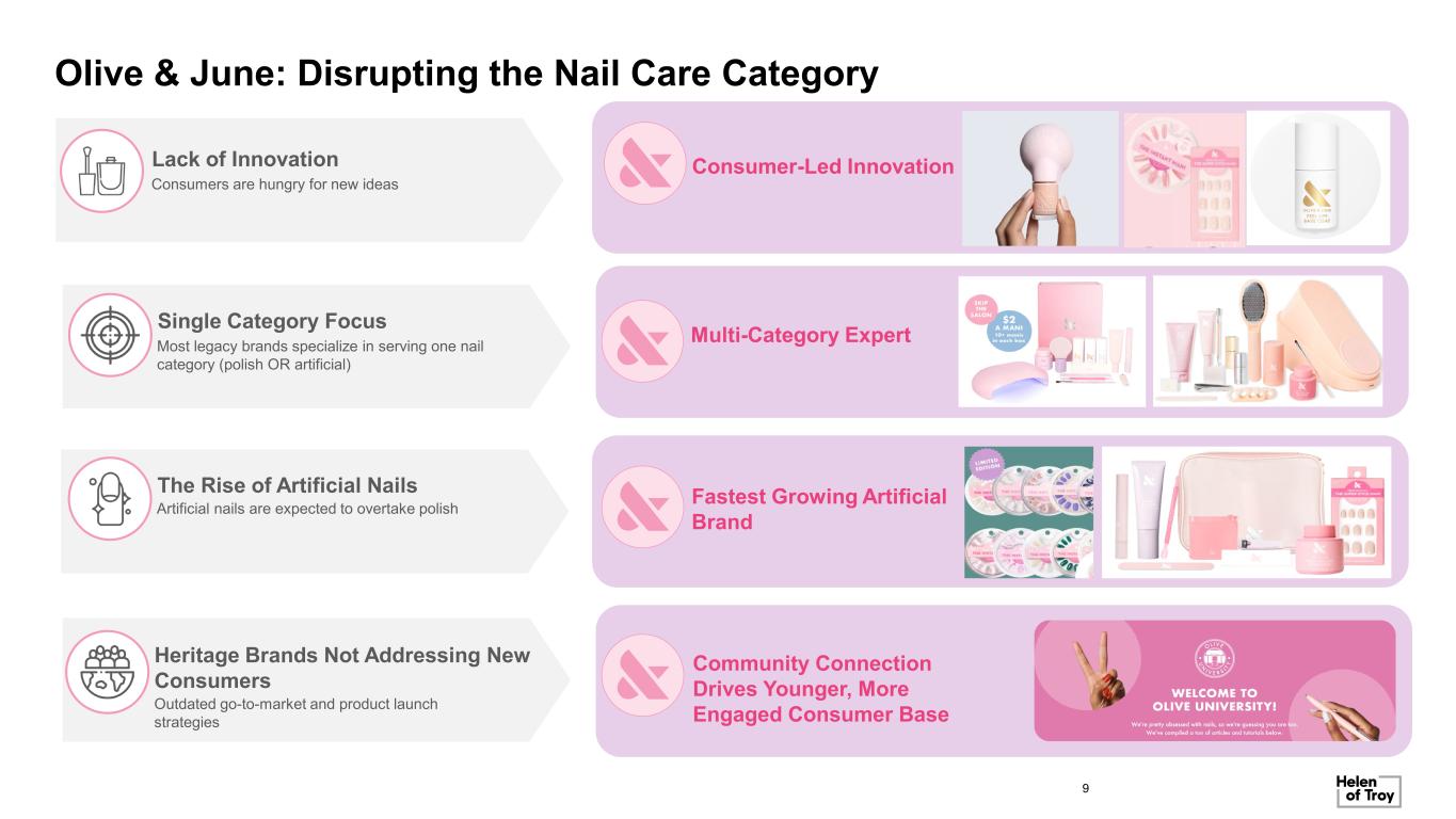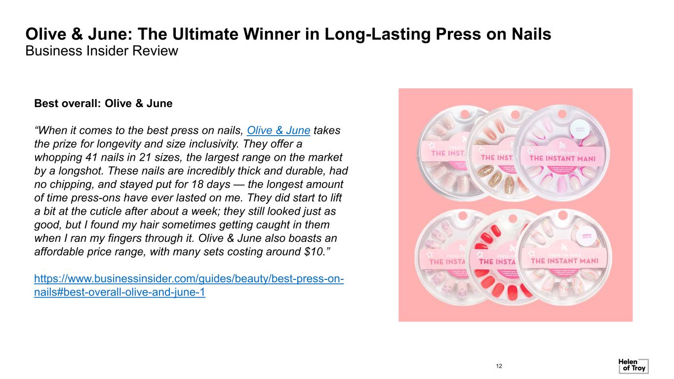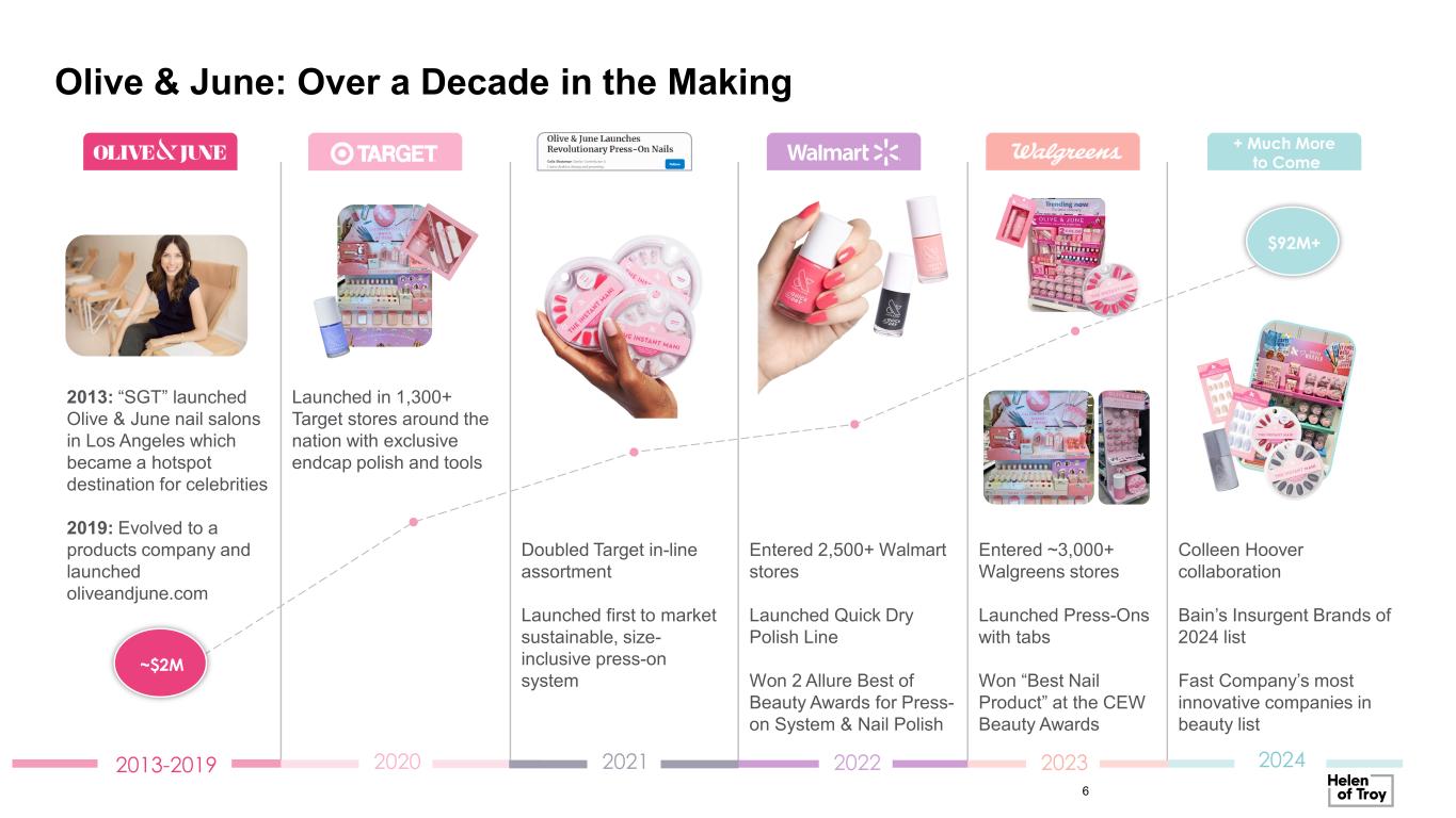 Olive & June:Making中的十年2013:“SGT”在洛杉矶推出Olive & June美甲沙龙,成为明星们的热点目的地2019:演变为一家产品公司,推出了oliveandjune.com,在全国1300多家Target商店推出,提供独家端盖抛光和工具,将Target in-line分类翻倍,首先向市场推出可持续,包容尺寸的Press-ON系统进入2500 +沃尔玛门店推出快干波兰Line荣获2项Allure Best of Beauty大奖Press-ON System &指甲油进入~3000 +沃尔格林门店推出的Press-ON with Tabs荣获CEW美容大奖“最佳美甲产品”Colleen Hoover与贝恩合作的2024年度反叛品牌榜单Fast Company在美容领域最具创新力的公司+更多未来2013-201920202021202220232024~200万美元9200万美元+ 6
