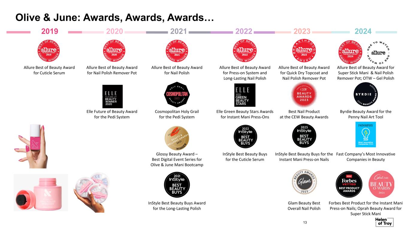 Olive & June:Awards,Awards,奖项…201920202021202220232024 Allure Best of Beauty Award for Cutril Serum Allure Best of Beauty Award for Nail Polish Remover Pot Elle Future of Beauty Award for the Pedi System Allure Best of Beauty Award for Nail Polish Cosmopolitan Holy Grail for the Pedi System Glossy Beauty Award – Olive & June Mani BootCamp inStyle Best Beauty Buys Award for Long-Lasting Polish Allure Best of Beauty Award for Press-on System和持久的指甲油Elle Green Beauty Stars Awards for Instant Mani Press-ONS instyle Best Beauty Buys for the Cutril Serum Allure Best of Beauty Award for Quick Dry TopcoatAnd Nail Polish Remover Pot Best Nail Product at the CEW Beauty Awards instyle Best Beauty Buys for the Instant Mani Press-on Nails Allure Best of Beauty Award for Super Stick Mani & Nail Polish Remover Pot;OTW – Gel Polish Byrdie Beauty Award for the Penny Nail Art Tool Fast Company’s Most Innovative Companies in Beauty Forbes Best Product for the Instant Mani Press-on Nails;Oprah Beauty Award for Super Stick Mani Glam Beauty Best Overall Nail Polish 13