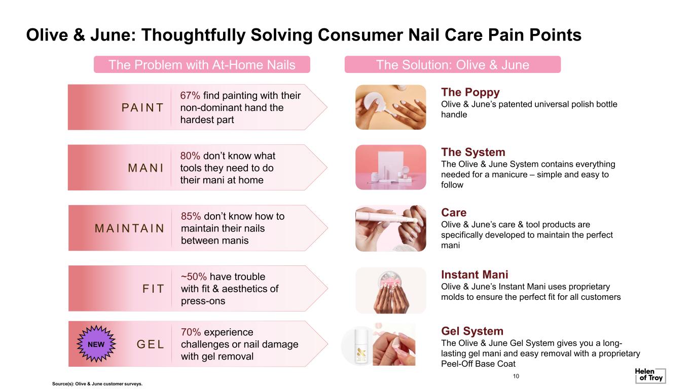 资料来源:Olive & June客户调查。居家问题钉出解决方案:Olive & June系统Olive & June系统包含美甲所需的一切–简单和轻松跟随Care Olive & June的care & tool产品专为保持完美的mani而开发Poppy Olive & June的专利万能抛光瓶手柄85%不知道美尼斯M A I N TA I N之间如何保养指甲80%的人不知道在家里做美甲需要什么工具M A N I 67%发现用非惯用的手绘画最难的部分PA I N T~50%有合身的问题&按压的美学F I T Instant Mani Olive & June的Instant Mani使用专有模具确保完美贴合为所有客户Olive & June:周到解决消费者指甲护理痛点70%体验挑战或指甲损伤与凝胶去除G E L凝胶系统Olive & June凝胶系统给你一个持久的凝胶mani和与专有的剥离底漆轻松去除NEW 10
