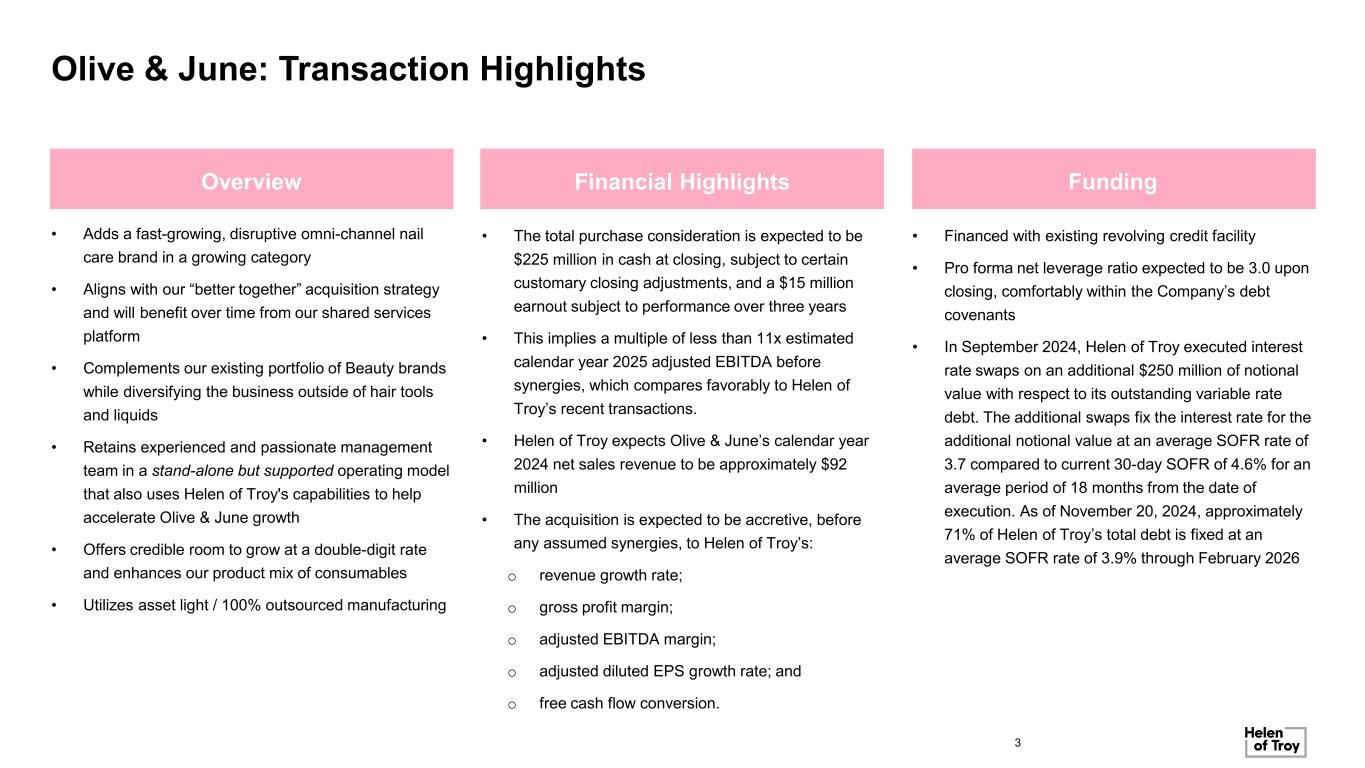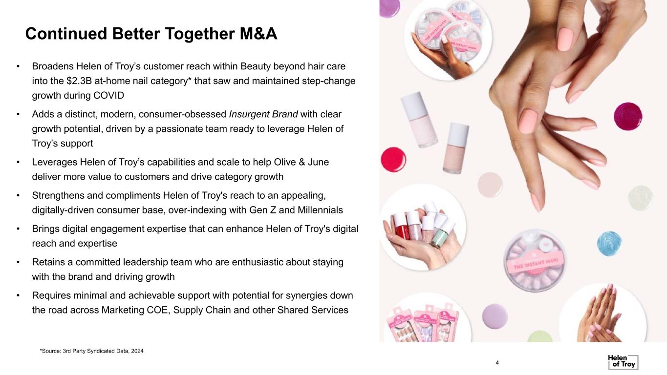 概览•增加了一个快速增长的、在不断增长的品类中具有颠覆性的全渠道指甲护理品牌•符合我们的“更好地在一起”收购战略,随着时间的推移将受益于我们的共享服务平台•补充我们现有的美容品牌组合,同时使发器和发液之外的业务多样化•以独立但受支持的运营模式保留经验丰富且充满激情的管理团队这也利用了海伦特洛伊家电的能力来帮助加速Olive & June的增长•为以两位数的速度增长提供了可靠的空间并增强了我们的消耗品产品组合•利用轻资产/100%外包制造财务亮点•预计交易结束时的总购买对价为2.25亿美元现金,但须按惯例进行某些收盘调整,以及根据三年的业绩获得1500万美元的收益•这意味着不到11倍的协同效应前的预计2025日历年调整后EBITDA的倍数,相比之下,Troy的丨海伦最近的交易有利。• 海伦特洛伊家电预计Olive & June在2024日历年的净销售收入约为9200万美元•在没有任何假设的协同效应之前,此次收购预计将使海伦特洛伊家电的:o收入增长率;o毛利率;o调整后EBITDA利润率;o调整后摊薄每股收益增长率;以及o自由现金流转换增值。资金•以现有循环信贷额度融资•预计收盘时的备考净杠杆率为3.0,在公司债务契约范围内• 2024年9月,海伦特洛伊家电对其未偿浮动利率债务额外的2.5亿美元名义价值执行了利率掉期交易。额外掉期将额外名义价值的利率固定在3.7的平均SOFR利率,而目前的30天SOFR为4.6%,自执行之日起的平均期限为18个月。截至2024年11月20日,截止到2026年2月,约71%的海伦特洛伊家电总债务以3.9%的平均SOFR利率固定不变,Olive & June:交易亮点3